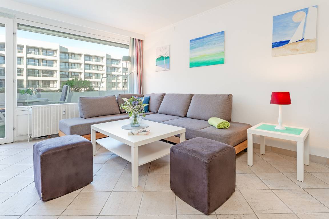 Nur über wenige Eingangsstufen erreichen Sie den direkt an der Strandpromenade gelegenen "Terrassenhügel". Der Fahrstuhl bringt Sie bequem in die 1. Etage. Sie betreten die Wohnung (ca. 53 qm) und befinden sich in einem Flur mit Einbauschrank, großem Spiegel und Garderobe. Rechts befindet sich das innenliegende Schlafzimmer mit Oberlichtern zum Wohnraum und einem Doppelbett mit 2 Einzelmatratzen (jeweils 80x200cm). Geradeaus über den Flur gelangen Sie in den hellen Wohn-Essbereich mit einer breiten Fensterfront und Zugang zum Balkon. Entspannen Sie sich nach einem erlebnisreichen Urlaubstag auf dem gemütlichen Ecksofa bei Ihrer Lieblingsfernsehserie. Im Handumdrehen lässt sich das bequeme Ecksofa (2x 80x200cm) zu einer weiteren Schlafmöglichkeit für 2 Personen herrichten.