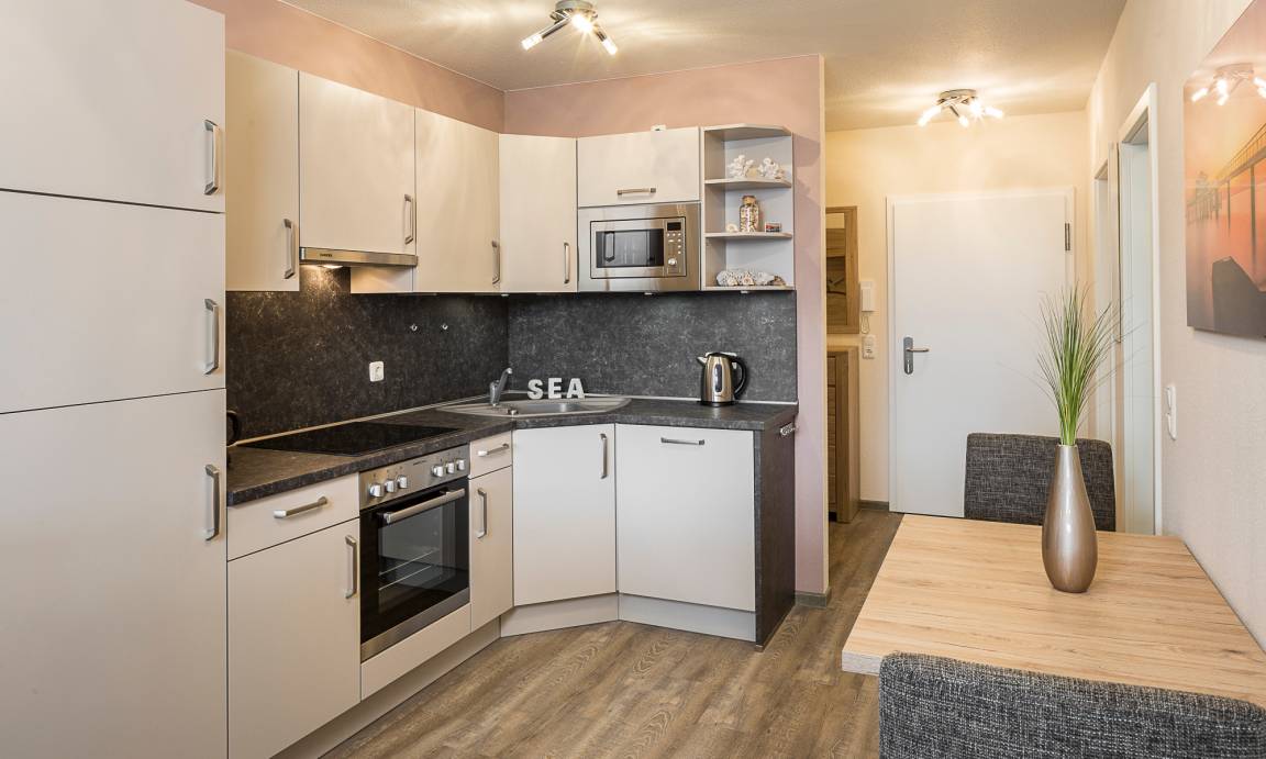 Die im zweiten Stockwerk gelegene 56 qm große Wohnung, ausgelegt in hellem Plankendesign, ist bequem mit dem Fahrstuhl zu erreichen. Neben einer technisch voll ausgestatteten Küche inkl. modernster Elektrogeräte und einem gemütlichen Essbereich, der zum Verweilen einlädt, gewährt Ihnen das großzügige und helle Wohnzimmer Behaglichkeit und Unterhaltung, wann immer Sie es wünschen: Flatscreen, Soundsystem, BluRay-Player. Ihnen steht in der gesamten Wohnung kostenloses WLAN zur Verfügung. Zudem lässt sich die Schlafcouch mit wenigen Griffen in ein Bett umbauen. Darüber hinaus ist die gesamte Wohnung durch elektrische Außenjalousien abdunkelbar. Im Schlafzimmer erwarten Sie ein 180x200 cm großes Boxspringbett und ein 43-Zoll-Flatscreen. Das Schlafzimmer ist klimatisiert. Im eigenen Hauswirtschaftsbereich finden Sie Waschmaschine und Trockner. Saisonbedingt (15.05. - 15.09.) gehört ein Strandkorb am Strand zur Wohnung. Zur sicheren Unterbringung Ihres Kraftfahrzeuges steht Ihnen ein Tiefgaragenstellplatz zur Verfügung.