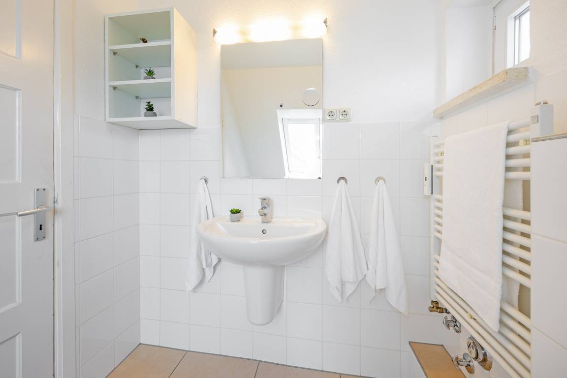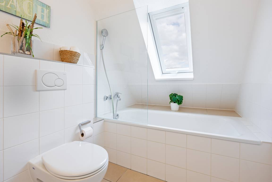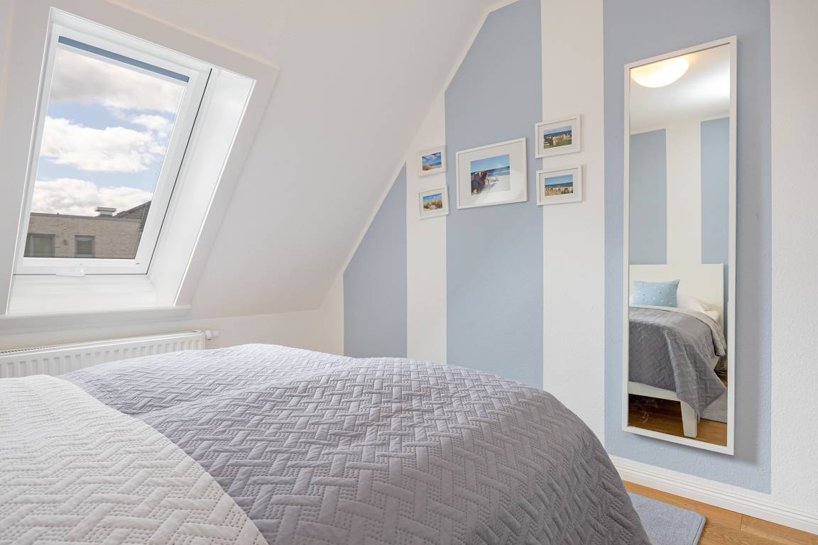 Ein langer heller Flur mit charmanten Dachschrägen und Dachfenstern verbindet die 3 Zimmer dieser Ferienwohnung.