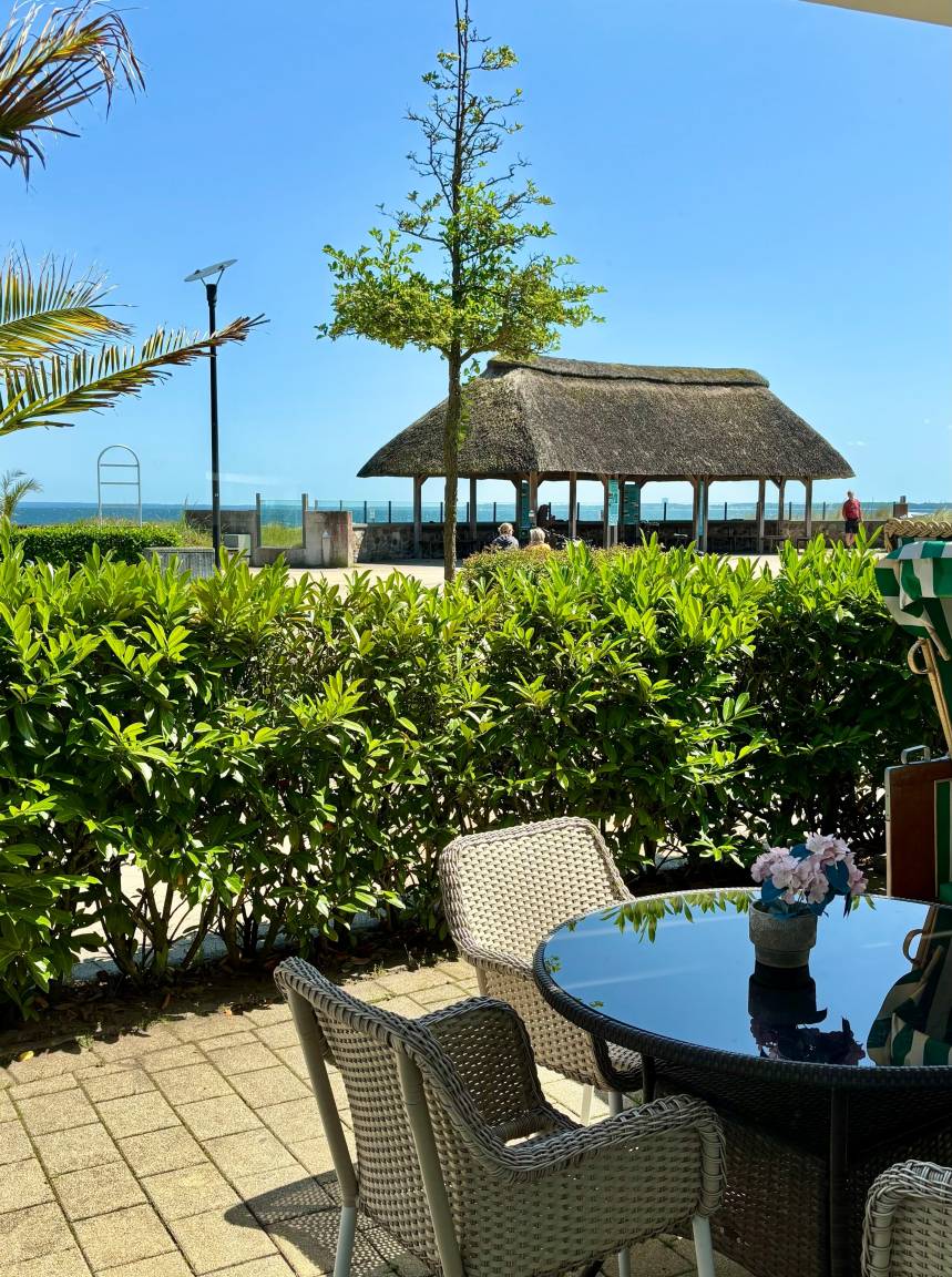 Vor der Ferienwohnung in Richtung Strandallee/Promenade befindet sich eine Terrasse mit Sitzmöbeln und einem Strandkorb.