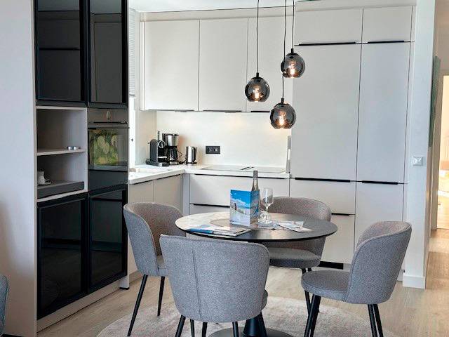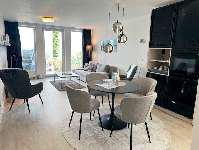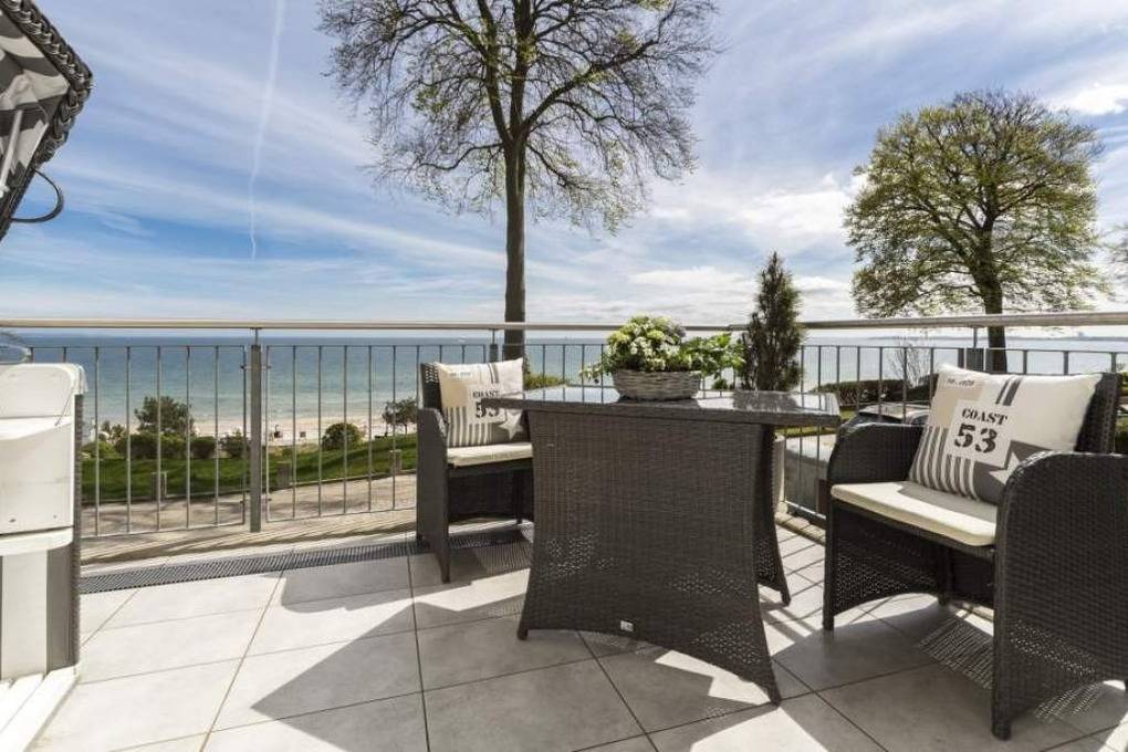 Diese helle 3-Zimmer-Ferienwohnung bietet Ihnen neben dem traumhaften Blick auf die Lübecker Bucht auch den Blick ins Grüne, mit Nachmittagssonne. Der Wohn- und Essbereich ist geschmackvoll und freundlich eingerichtet und verfügt über ein bequemes Sofa, welches sich in wenigen Handgriffen zu einem Schlafsofa umgestalten lässt, und zwei Sessel. Kostenloser WLAN-Zugang, Flachbildfernseher. Vom Wohnzimmer treten Sie hinaus auf den ersten Balkon (Richtung Süd/Osten), hier empfängt Sie ein phantastischer Meerblick, den Sie vom dort befindlichen Strandkorb genießen können. Die offene Küche ist in den Wohn-Essbereich integriert. Das erste Schlafzimmer verfügt über den Zugang zum zweiten Balkon. Das Schlafzimmer ist mit einem Doppelbett (1,60 x 2,00m), einem Kleiderschrank sowie mit einer Anrichte / TV ausgestattet. Auf dem 2. Balkon Richtung Südwest können Sie den Blick ins Grüne und die Mittags- bzw. Nachmittagssonne genießen. Das zweite Schlafzimmer verfügt über ein sehr bequemes Schrankbett (1,40 x2,00m). Hier haben Sie die Möglichkeit, den Raum tagsüber z. B. für Ihre Kinder als Spielzimmer oder als Lesezimmer zu nutzen. Selbstverständlich steht Ihnen auch hier ein TV-Gerät zur Verfügung. Das in heller Optik gehaltene Badezimmer ist mit einer Wanne mit Duschvorrichtung ausgestattet.