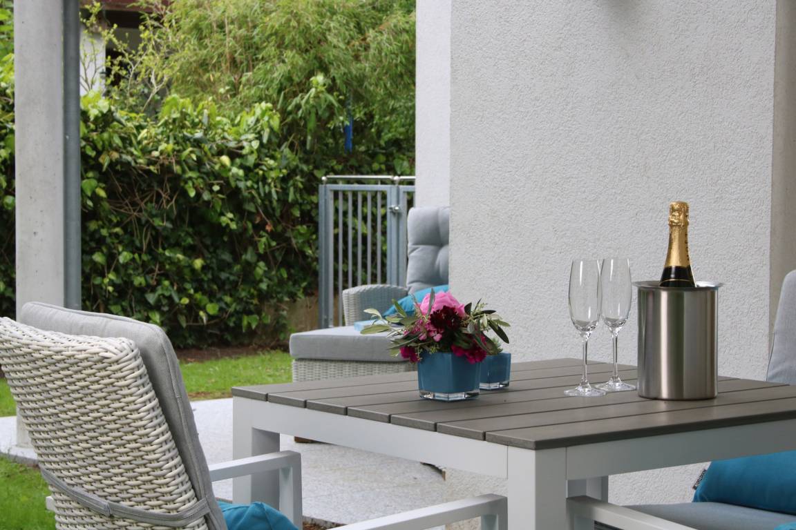 Terrassen: Die beiden überdachten Terrassen liegen in ruhiger und grüner Umgebung und sind auch an etwas kühleren Tagen durch Infrarot-Terrassenstrahler ein schöner Rückzugsort zum Entspannen. Es erwarten Sie hier bequeme, verstellbare Liegesessel und eine Esstischgruppe. Von der Terrasse aus haben Sie einen kleinen seitlichen Blick auf die Ostsee.