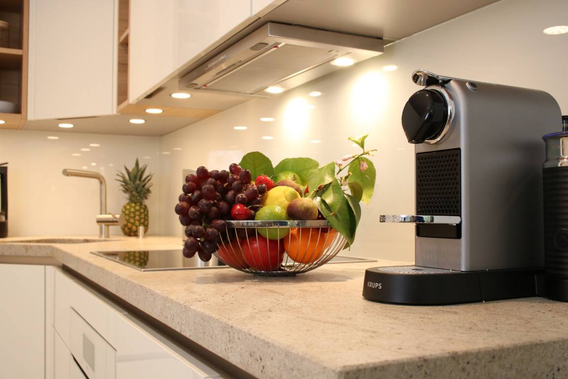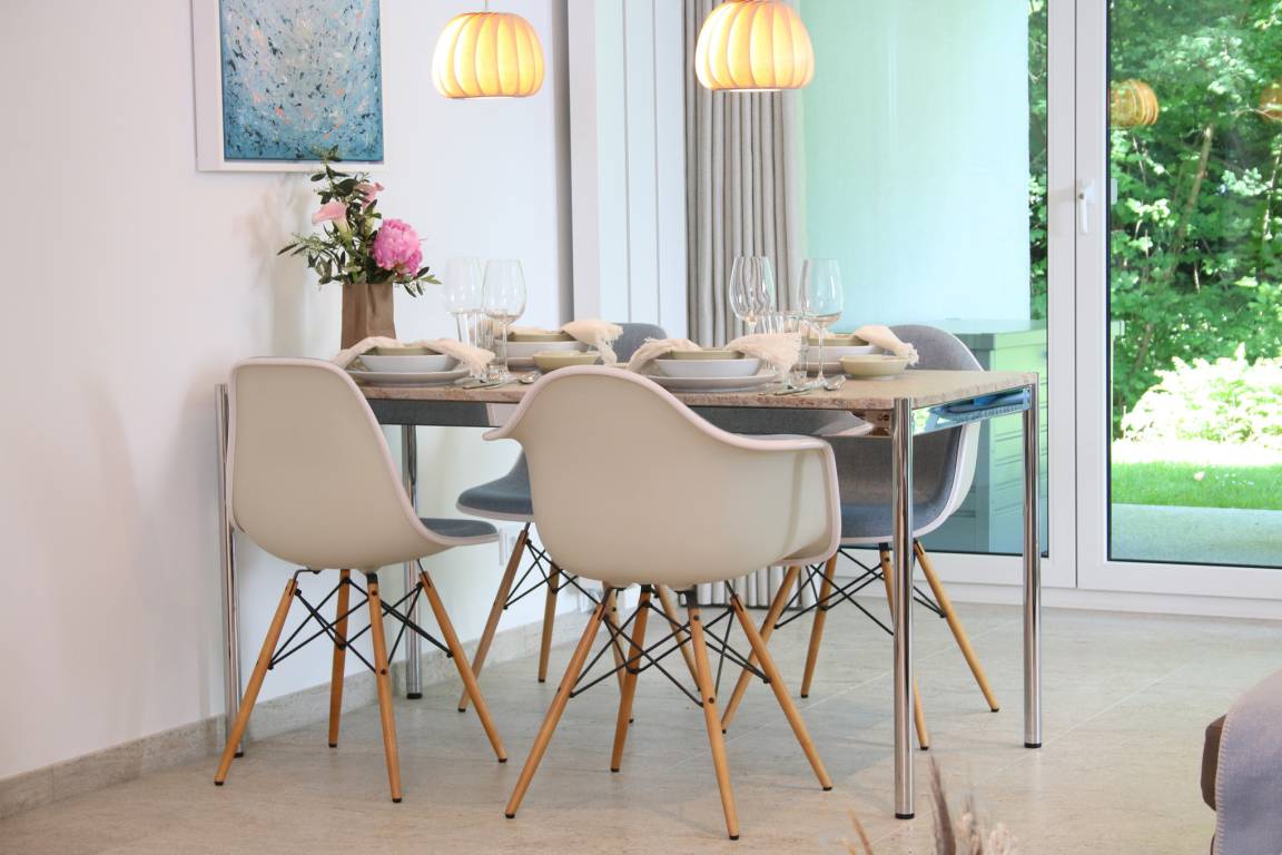 Wohn-Ess-Bereich: Genießen Sie Ihr Frühstück und andere kulinarische Erlebnisse in der hochwertigen Warendorf-Küche mit Miele-Einbaugeräten, einer Nespresso-Maschine sowie hochwertigem Rosenthal-Porzellan. Es erwarten Sie Design-Klassiker von USM Haller (Esstisch, Vitrine und TV-Board) und COR (Ledersofa mit Schlafsofafunktion) sowie Esstisch-Stühle, Couchtische und ein Schaukelstuhl zum Relaxen der Designmarke VITRA. Ein Samsung 65″-Smart-TV inkl. Soundbar, ein BOSE-Wave-Soundsystem für WLAN-Radio und CD und kostenloses unbegrenztes Highspeed-WLAN stehen Ihnen für Entertainment und digitales Erleben zur Verfügung. Gerne können Sie Ihr Smartphone sowohl mit dem Samsung-Smart-TV/Soundbar als auch mit dem BOSE-Wave-Soundsystem verbinden und Ihre Lieblingsmusik hören.