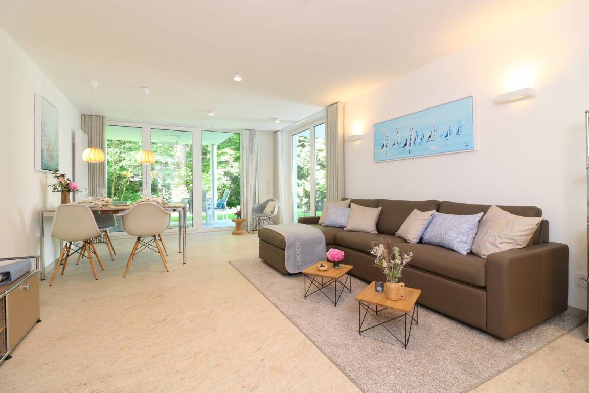 Strandnahe und großzügige 2-Zimmer-Ferienwohnung – 67 m² im EG, mit Fahrstuhl zur Tiefgarage. Zwei überdachte Süd/Süd-West-Terrassen, exklusive Designer-Möbel, Wellnessbad mit Regendusche, inkl. Strandkorb (saisonbedingt 15.05. – 15.09.) und kostenlosem 500-Mbit-Highspeed-WLAN, Tiefgaragen-Stellplatz (Höhe 2,00 m), E-Ladung gegen Gebühr möglich (11 kW Ladeleistung, Typ-2-Steckdose).