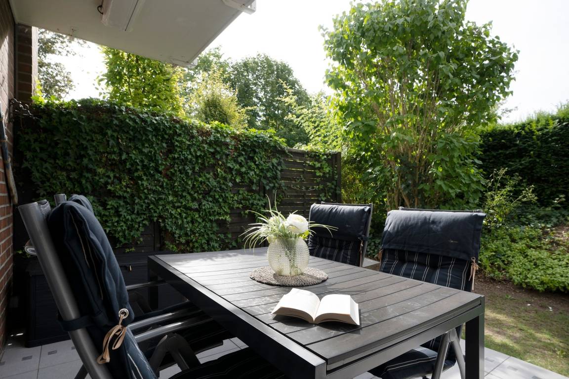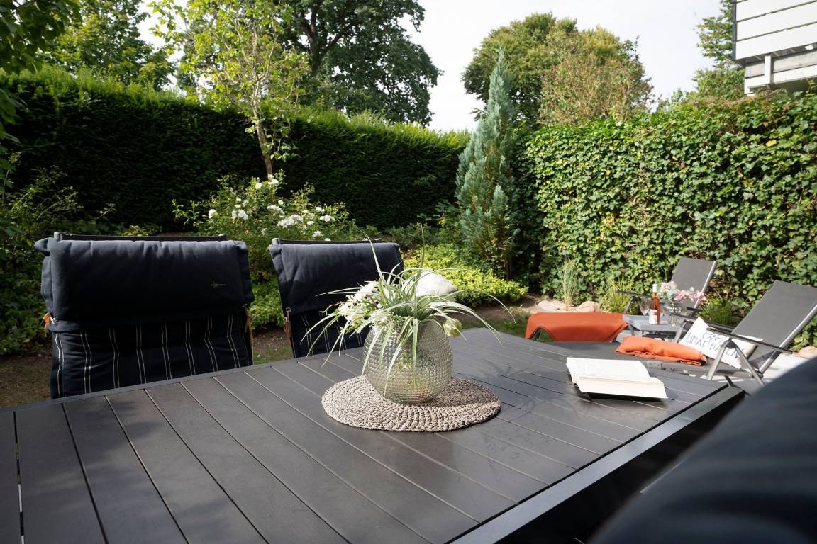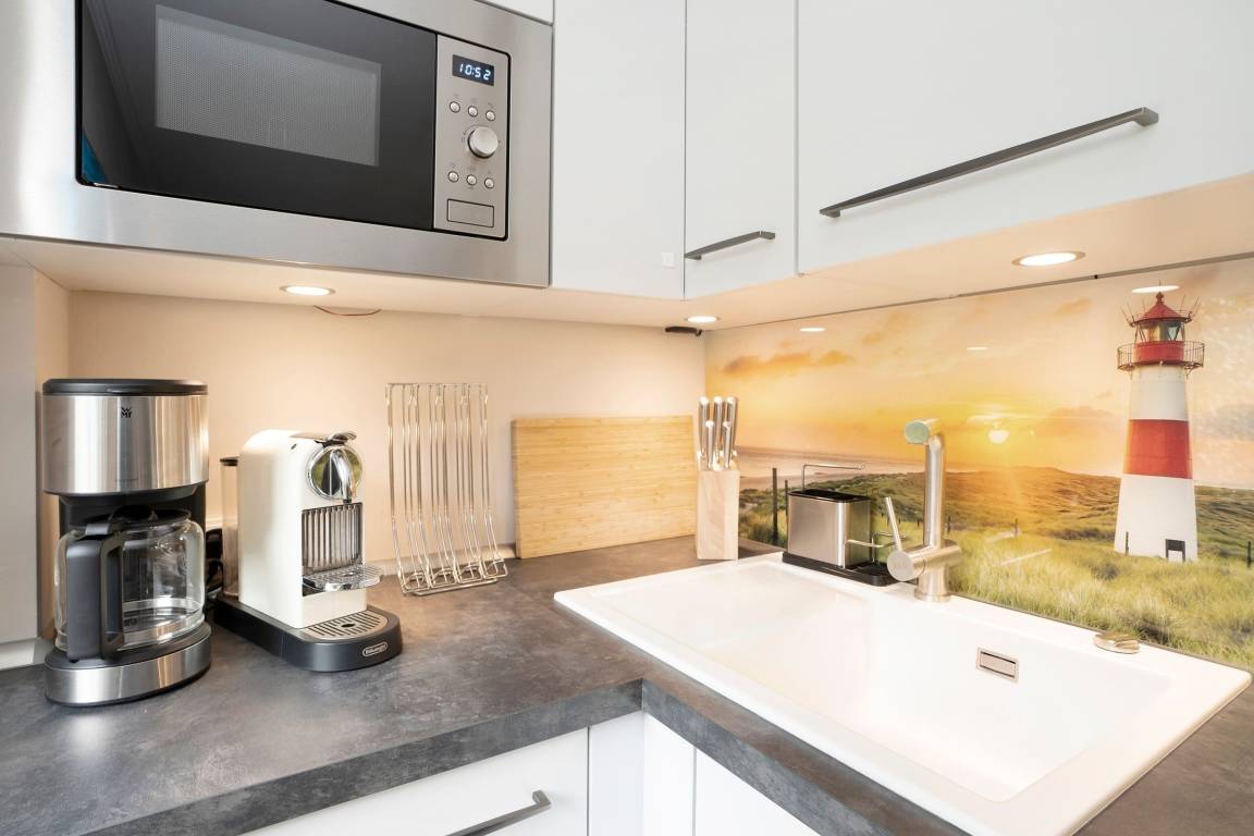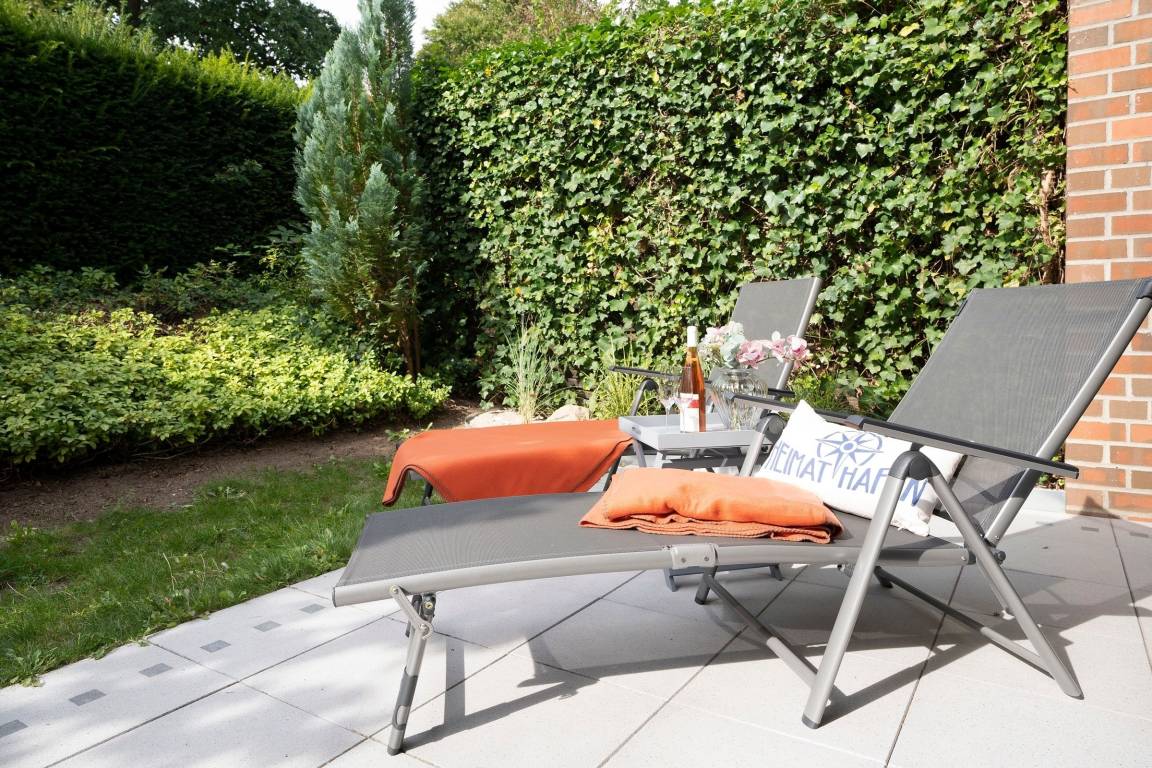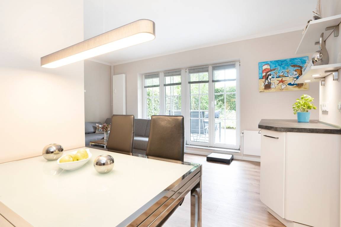 Im Wohnraum befinden sich eine hochwertige Couchgarnitur (Ottomane), welche zu einem Doppelbett (140x200 cm) ausgezogen werden kann. Ein DAB+-Internetradio mit Bluetooth, ein 55 Zoll Smart-TV und eine Spielesammlung lassen keine Langeweile aufkommen. Die moderne, sehr gut ausgestattete Einbauküche ist in den Wohnbereich integriert und mit den notwendigen Alltagshelfern und sogar einem Waffeleisen voll ausgestattet. Am Esstisch finden 4 Personen Platz. Im separaten Schlafzimmer sorgt ein Doppelbett (160x200 cm) für erholsame Nachtruhe. Außerdem ist das Schlafzimmer zusätzlich mit einem TV ausgestattet. Das hell geflieste Badezimmer mit Dusche und Haartrockner rundet das Angebot dieser Ferienwohnung ab. Die nicht einsehbare, windgeschützte Terrasse mit Markise bietet eine schöne Süd-Ausrichtung und verfügt über Gartenmöbel (Gartentisch mit 4 Stühle, 2 Relax-Liegestühle und 2 Liegen) mit Polsterauflagen.