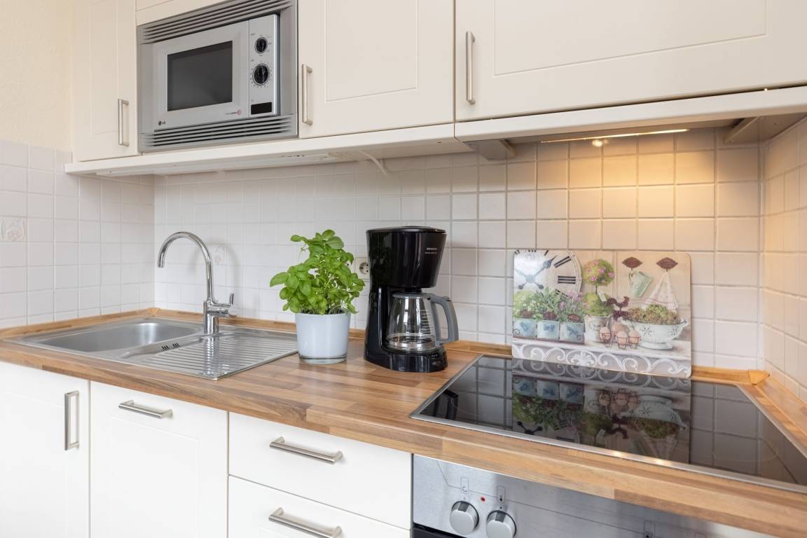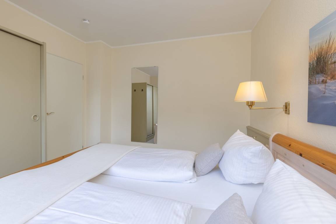 Die Couch bietet nach einem langen Strandtag ein angenehmes Plätzchen zum Relaxen. Für die Nacht kann man das Sofa zu einer großen Schlafstätte für zwei Personen mühelos herrichten. Vom Wohnbereich aus erreichen Sie den möblierten Balkon. Laue Sommerabende werden hier zu einem perfekten Urlaubserlebnis bei einem leckeren Glas Wein und einem selbst gekochten Abendessen. Für eine angenehme Nachtruhe im Urlaub sorgt das Schlafzimmer mit Doppelbett (2x 90x200 cm), Nachttische, Nachttischlampen und einem Kleiderschrank für Ihre Garderobe. Neben dem Schlafzimmer ist das tageslichthelle, moderne Duschbad mit Handtuchwärmer und WC. Der WLAN-Anschluss ist inklusive.