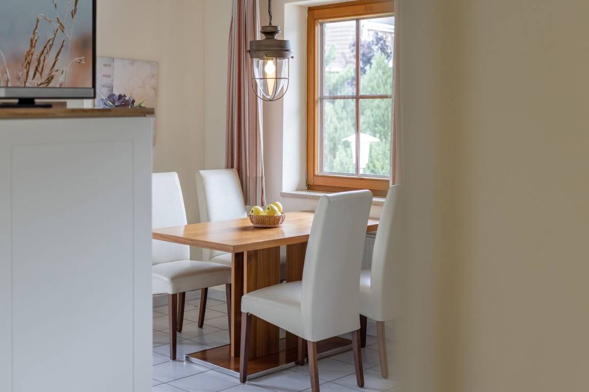 Das freundliche Wohnzimmer ist mit einer offenen Küche ausgestattet. Der Esstisch lädt zum gemeinsamen Essen ein.