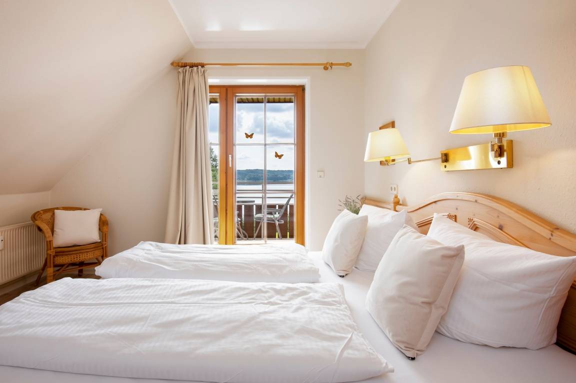 Hier finden bis zu 6 Personen ausreichend Platz und Komfort. Beide Schlafzimmer sind mit bequemen Doppelbetten (je 180x200 cm), Kleiderschrank und TV ausgestattet. Das Wohnzimmer verfügt über eine bequeme Doppelschlafcouch (ca. 140x200 cm), 2 Sessel, integrierten Essbereich und offene, gut ausgestattete Küche. Für Unterhaltung sorgen Fernseher, Radio und CD-Player. Das hell geflieste Badezimmer verfügt über eine Badewanne mit Duschfunktion. Als absolutes Highlight verfügt sowohl das Wohnzimmer, als auch das größere der beiden Schlafzimmer über einen direkten Balkonzugang! Genießen Sie von beiden Balkonen aus einen herrlichen Ausblick direkt auf den malerischen Pönitzer See. Pure Idylle!
