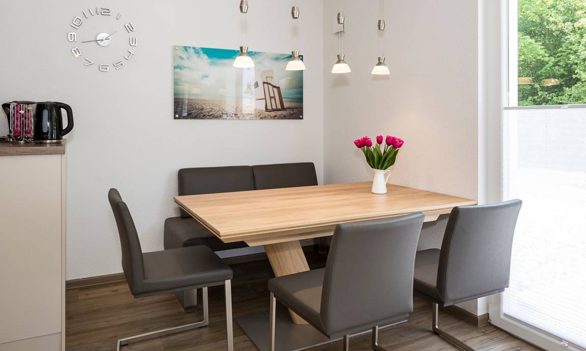 Diese exklusive 3-Zimmerwohnung ist gut durchdacht und mit viel Liebe bis ins Detail von den Eigentümern eingerichtet worden. Der Wohn-Essbereich ist hell und freundlich. Im Wohnbereich ist eine sehr gemütliche Couch, welche in kurzen Handgriffen zu einem Bett ( 1.60x200 Liegefläche, Lattenrost mit Bultexmatratze ) umgewandelt werden kann. In dem ansprechenden Sideboard finden ein Radio, EIN MP3-Player, ein Blu-ray-Player sowie ein Full-HD-LED-SMART-TV ihren Platz. Für fröhliche Spieleabende stehen Ihnen gängige Karten- und Brettspiele (Spielesammlung, Rommé-Kartenspiel, UNO, Phase 10, Kniffel) zur Verfügung.
