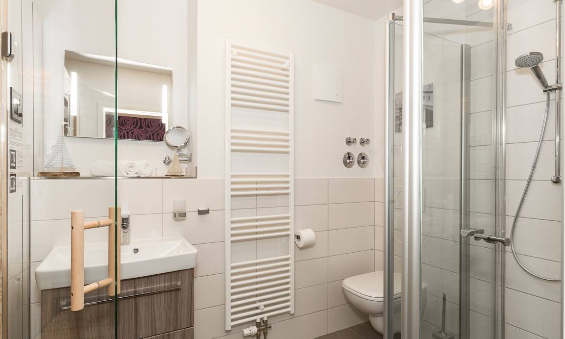 Die zwei Bäder: jeweils mit bodengleicher Dusche, Handtuchheizkörper, Föhn und Kosmetikspiegel. Für Saunafreunde ist in einem Badezimmer eine Sauna von RÖGER 180x160 Typ Baleo (keine Dampfbadfunktion).
