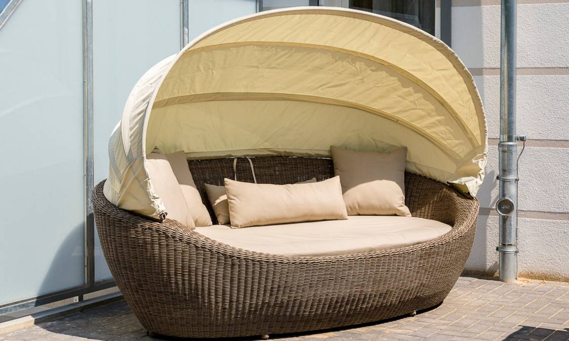 Auf der Terrasse stehen für Sie ein Gartentisch mit sechs Stühlen, eine Lounge-Insel Paradiso sowie ein Sonnenschirm zur Verfügung.