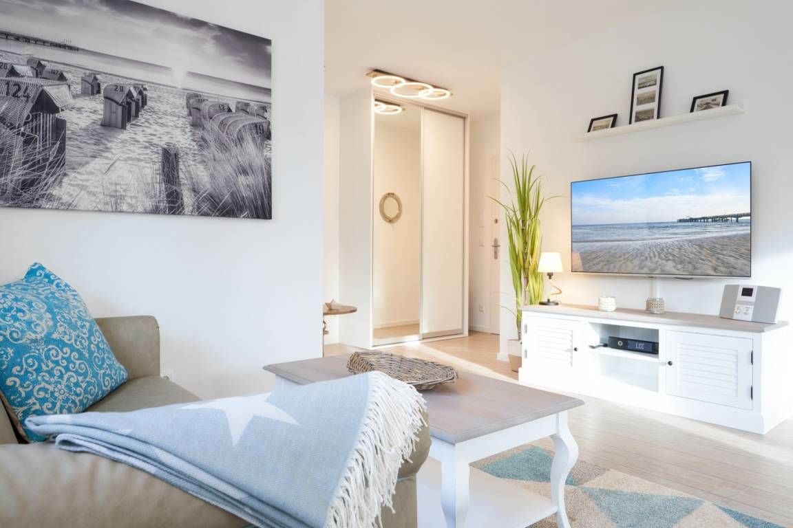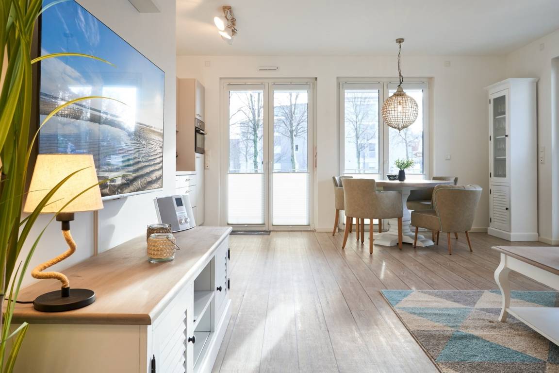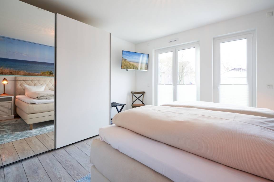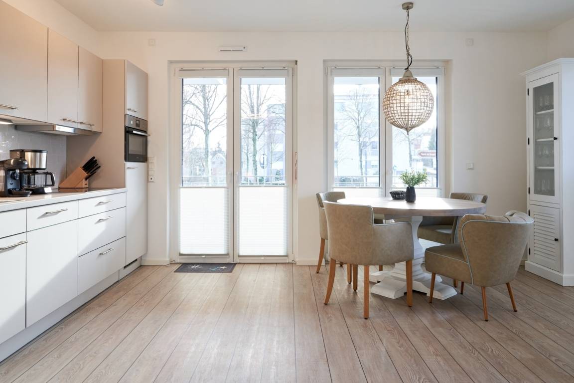 Die 2-Zimmer-Ferienwohnung LEE ist mit bodentiefen Fenstern ausgestattet. An allen Fenstern befindet sich ein Sichtschutz. Die Einbauküche ist komplett ausgestattet. Backofen, Ceran-Kochfeld, Mikrowelle, Geschirrspüler, Kühlschrank mit Gefrierfach, Filterkaffeemaschine, Tassimo-Kapselmaschine, Eierkocher, Mixer, Toaster und Wasserkocher. Sehr schöner, heller Wohnbereich mit einem hochwertigen Sofa, welches mit kurzen Handgriffen in ein bequemes Schlafsofa ( 1,30m x 1,95m) hergerichtet werden kann. [nbsp] Wand-TV ( 55 Zoll ), Internetradio . Der feine Essbereich ist mit einem runden Tisch und mit vier bequemen Sesseln ausgestattet. [nbsp] Aus dem Wohnbereich gelangen Sie auf den herrlichen, überdachten Süd-West-Balkon. Hier stehen Ihnen Tisch und Stühle zur Verfügung. Das Schlafzimmer ist mit einem Boxspringbett (2,00 m x 2,00 m), einem Kleiderschrank, 2 Nachttischen sowie einem Wand-TV (43 Zoll) ausgestattet. Sind Sie es gewohnt, im Dunkeln zu schlafen? Kein Problem, denn im Schlafzimmer stehen Ihnen elektrische Außenrollläden zur Verfügung. Das Duschbad in heller Optik mit bodengleicher Dusche / Regendusche, mit separater Handbrause, Handtuchheizkörper, Fön, Kosmetikspiegel. Die gesamte Wohnung ist mit einer Fußbodenheizung ausgestattet.