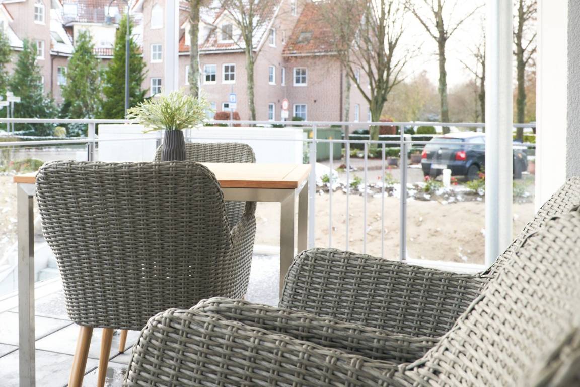 Wohnung LEE – für 2 Personen plus 1. Helle und freundliche sowie sehr ansprechende 2-Zimmerwohnung, ca. 66 m², im Hochparterre, in der Villa Scharbeutz, großer Süd-Westbalkon. Elektrische Außenrollläden im Schlafzimmer, Kfz-Außenstellplatz. Fahrstuhl, Waschmaschine und Trockner im Keller.