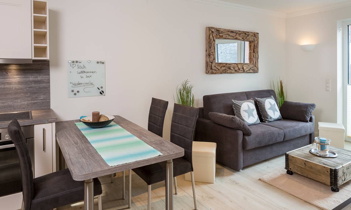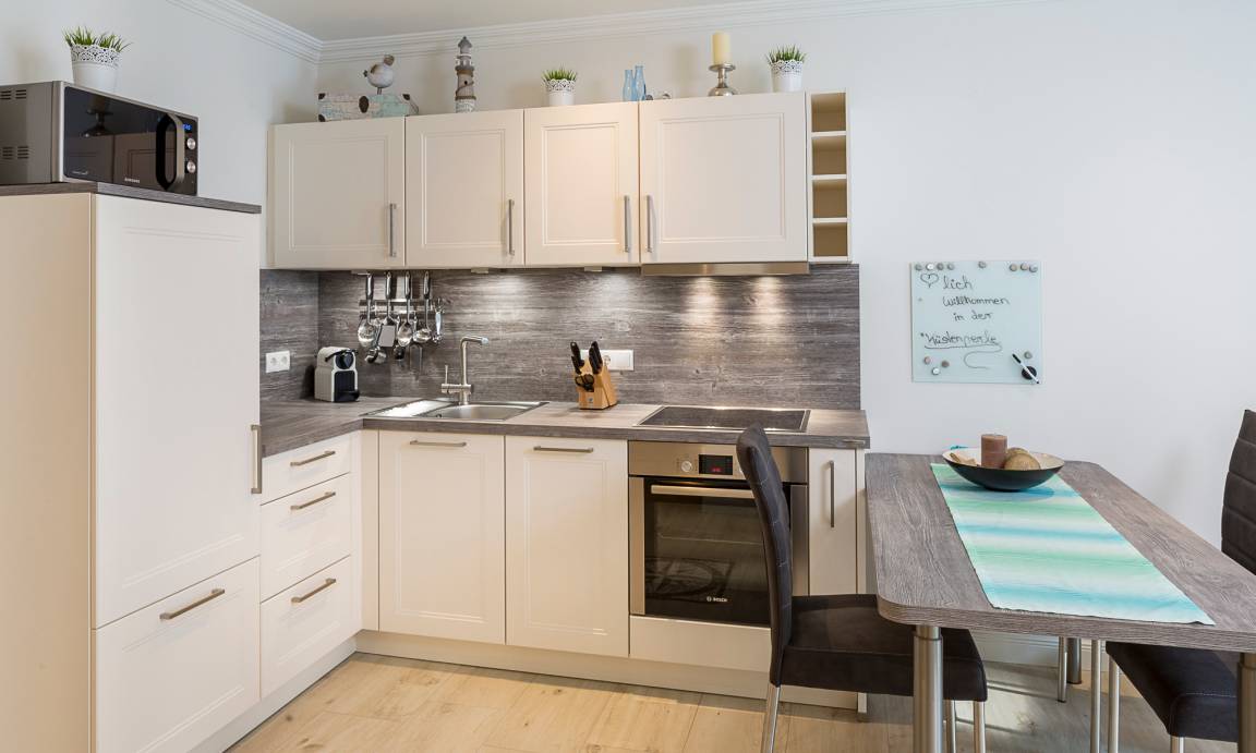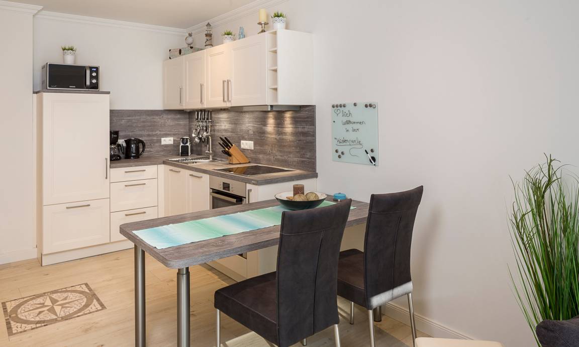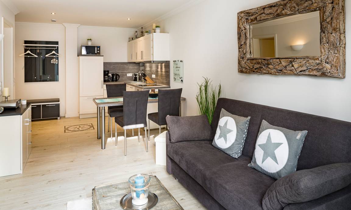 Diese schöne Ferienwohnung ist durchgehend mit einem Bodenbelag in angenehmer Holzoptik und Fußbodenheizung ausgestattet. Der Wohnraum verfügt über einen Ess- sowie einen gemütlichen Sitzbereich. Die Couch lässt sich mit nur wenigen Handgriffen in eine bequeme Schlafcouch (1,40 x 2,00m) umfunktionieren. Neben dem Flachbildfernseher steht Ihnen eine moderne HiFi-Anlage zur Verfügung. Kostenloses WLAN ist selbstverständlich. Die offene Küche ist ausgestattet mit u.a. Geschirrspüler, Backofen und Induktionskochfeld, Kühlschrank mit Gefrierfach. Neben einer Filterkaffeemaschine steht zusätzlich eine Nesprosso-Kapselmaschine für Sie bereit. Das Schlafzimmer ist mit einem Kleiderschrank und einem komfortablen Boxspringbett (1,80 x 2,00m) sowie einem Flachbildfernseher ausgestattet. Ein schönes Badezimmer mit bodentiefer Dusche mit Regendusche, zusätzlichem Handtuchheizkörper, Föhn und Waschmaschine erwartet Sie. Ein Abstellraum gehört ebenfalls zur Wohnung.