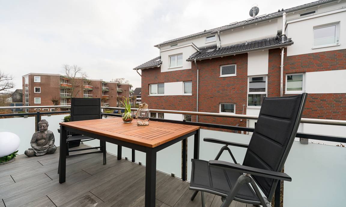 Der Balkon, Richtung Süden, mit hochwertigem Tisch und Stühlen lädt zu entspannten Stunden ein.