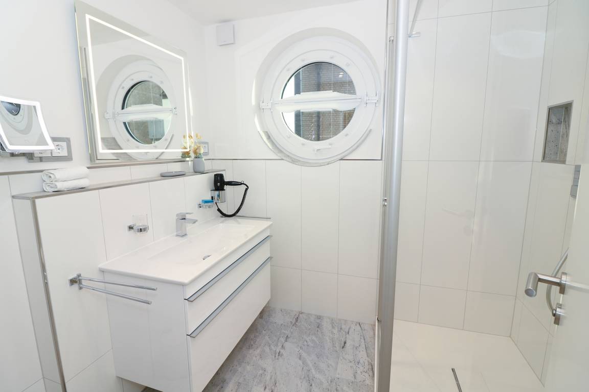 Wellnessbad: In Ihrem mit viel Liebe von Villeroy [&] Boch gestalteten Wohlfühlbad mit Bullaugen-Fenster lädt Sie eine Regendusche zum Erfrischen ein. Ein großer Waschtisch mit Unterschrank, WLAN-Radio, Handtuchheizkörper; beleuchteter Kosmetikspiegel und Haartrockner runden das Wohlfühlpaket ab. Waschmaschine und Trockner stehen Ihnen im Gemeinschaftskeller zur Verfügung und sind über einen Münzzähler zu bedienen.