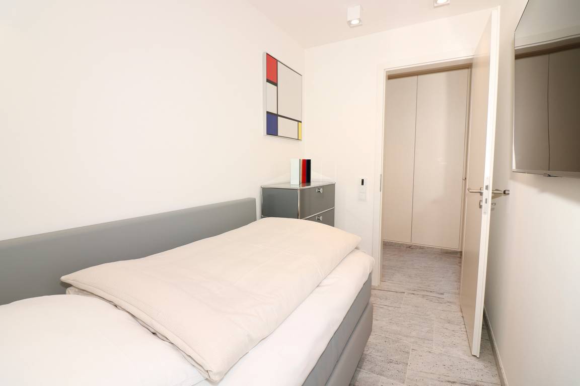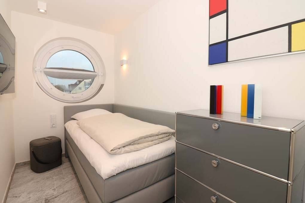 Kinderzimmer: Auch hier erwartet Sie ein hochwertiges Boxspringbett (0,90 x 2,00m) für Ihren erholsamen Schlaf. Ein USM-Schubladenschrank bietet hier zusätzlichen Platz. Zum Lesen oder Spielen liegen diverse Bücher und Spiele bereit. Für bestes Entertainment finden Sie hier einen 49"-Samsung-Smart-TV mit LAN-Anschluss.