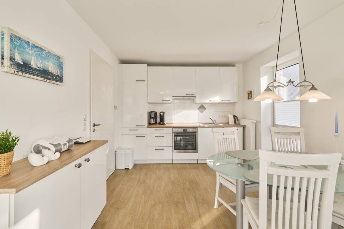 Die Ferienwohnung verzaubert mit ihrem, im maritimen Stil gehaltenen, Wohnzimmer und ist mit hochwertigen Möbeln eingerichtet. Es erwarten Sie dort eine bequeme Couch, 2 Sessel und ein Sat-Flachbildschirmfernseher. Die moderne, offene Küche ist voll ausgestattet und perfekt in den Wohnraum integriert. Ihnen stehen eine Filterkaffeemaschine, eine Senseo-Kaffeepadmaschine, ein Wasserkocher sowie ein Toaster zur Verfügung. Zudem verfügt die Küche über ein Cerankochfeld, einen Backofen und einen Geschirrspüler. Der Essbereich bietet ausreichend Platz für ein ausgiebiges Frühstück oder einen gemütlichen Spieleabend. Das helle Schlafzimmer ist mit einem Doppelbett (1,80 × 2,00 m) und einem großen Kleiderschrank ausgestattet und hat direkten Zugang zu dem Balkon.