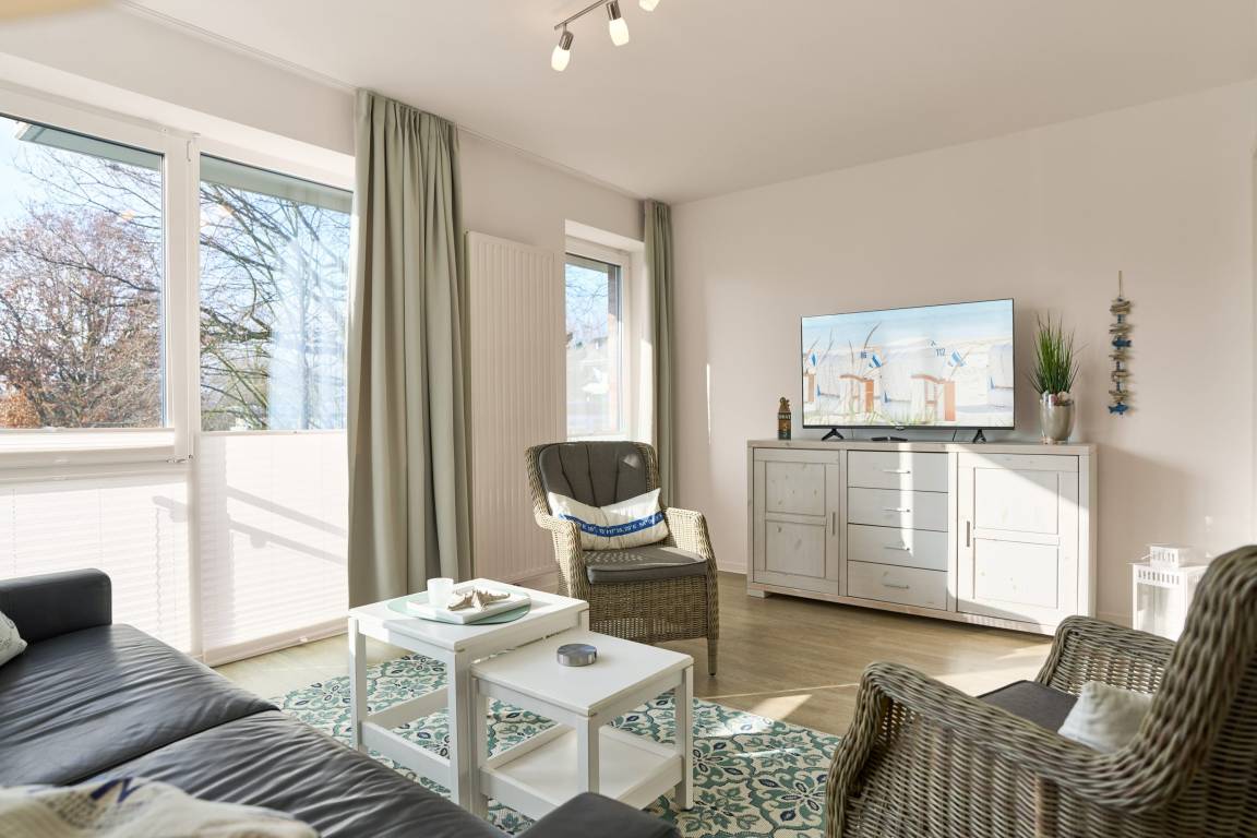 Diese freundliche Ferienwohnung im 1. OG mit bodentiefen Fenstern in Wohn- und Schlafzimmer verfügt über einen traumhaften Südwest-Balkon mit Blick ins Grüne. Nur wenige Meter sind es, bis Sie den gegenüberliegenden Sandstrand erreichen. In wenigen Gehminuten erreichen Sie die Dünenmeile, mit ihren schönen Cafés, Restaurants, Bäckereien und Geschäften.
