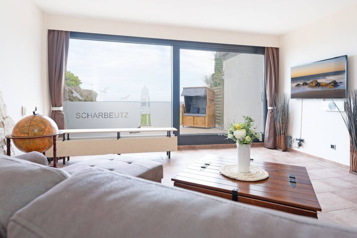 Diese zauberhafte Ferienwohnung heißt Meerblick Lounge – und macht ihrem Namen alle Ehre. Betreten Sie das lichtdurchflutete Wohnzimmer mit der großer Fensterfront, nehmen Sie Platz auf der kuscheligen Sofa-Landschaft und lassen Sie sich von dem sagenhaften Meerblick verzaubern. Für Unterhaltung sorgt ein TV-Gerät – aber auf die Ostsee zu schauen, ist sicher schöner. Kommen Sie raus auf die davor liegende, geräumige Terrasse. Hier können Sie im Strandkorb Ihren ersten Morgenkaffe trinken und den Sonnenaufgang über dem Meer genießen. Der Strand selbst ist auch nur rund 60 Meter entfernt. Ostsee pur. Die in den Wohnbereich integrierte Küche mit Spülmaschine bietet Ihnen alle Annehmlichkeiten, die Sie im Urlaub für die Zubereitung Ihrer Lieblingsmenüs brauchen. Raffiniert: Sie können komfortabel am Ess-Tresen sitzen, gleichzeitig sorgt der Tresen als Raumteiler für eine gemütliche Atmosphäre. Nach einem erlebnisreichen Tag an der Küste finden Sie angenehme Nachtruhe zum einen im Wohnzimmer: Das Sofa lässt sich in ein Doppelbett (ca. 140x200 cm) verwandeln. Zum anderen steht Ihnen im innenliegenden Schlafzimmer ein Doppelbett (2x 90x200 cm) sowie ein weiteres TV-Gerät zur Verfügung. In beiden Räumen lässt sich ein Babybett aufstellen. Das innenliegende Bad verfügt über eine ebenerdige Dusche. Ein Kleiderschrank im Flur bietet ausreichend Platz zum Verstauen der Urlaubsgarderobe.