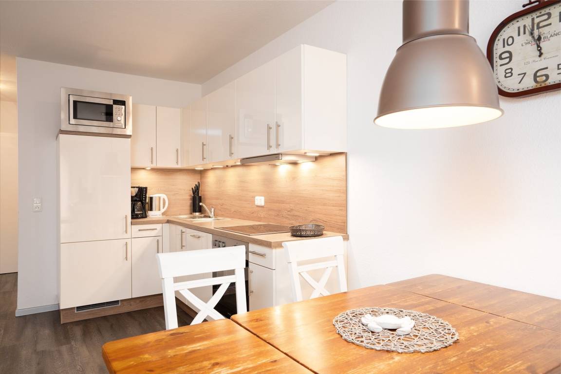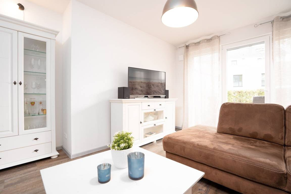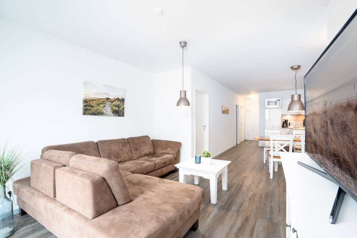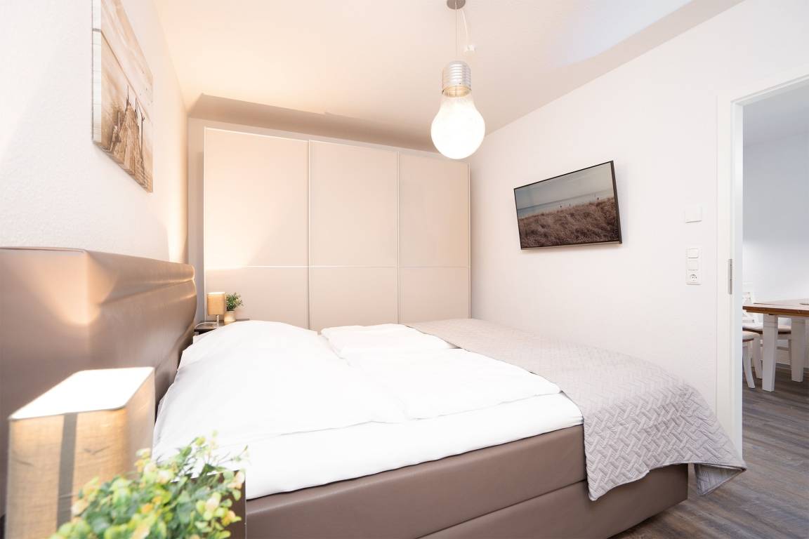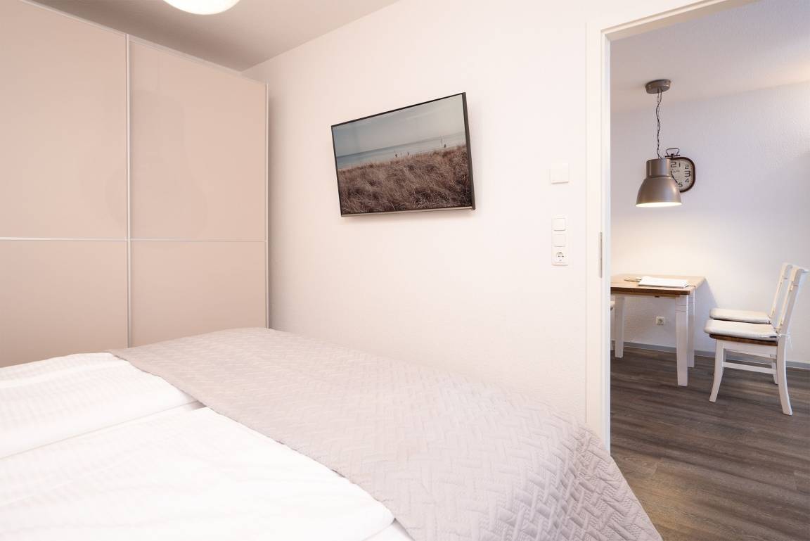 Der helle Wohnbereich empfängt Sie mit einer Schlafcouch (110x 190 cm), einem Flachbild-TV und dem Wohnzimmertisch. In der voll ausgestatteten, offenen Küche können Sie Ihre Mahlzeiten zubereiten und gleich am Esstisch mit 4 Stühlen einnehmen. Das erste Schlafzimmer verspricht geruhsame Nächte im Boxspringdoppelbett (2x 90x200 cm), Ihre Kleidung können Sie im Kleiderschrank verstauen. Eine weitere Schlafmöglichkeit befindet sich im kleinen, innenliegenden Zimmer mit Einzelbett (100x205 cm). Das ebenfalls innenliegende, aber dennoch moderne Bad ist mit Dusche/WC und beheizbarem Handtuchhalter ausgestattet. Die gesamte Wohnung verfügt über eine Fußbodenheizung und lässt sich durch Außenjalousien verdunkeln. Auf der sichtgeschützten, möblierten Terrasse können Sie die Urlaubstage so richtig genießen.