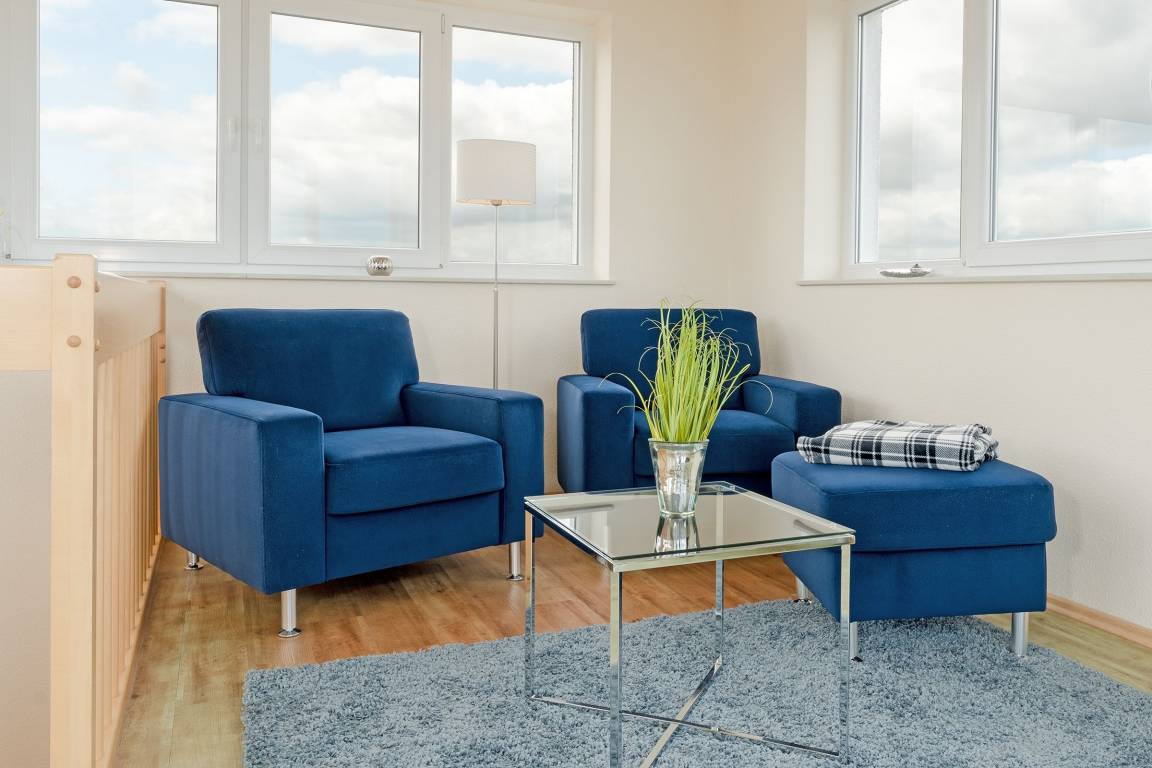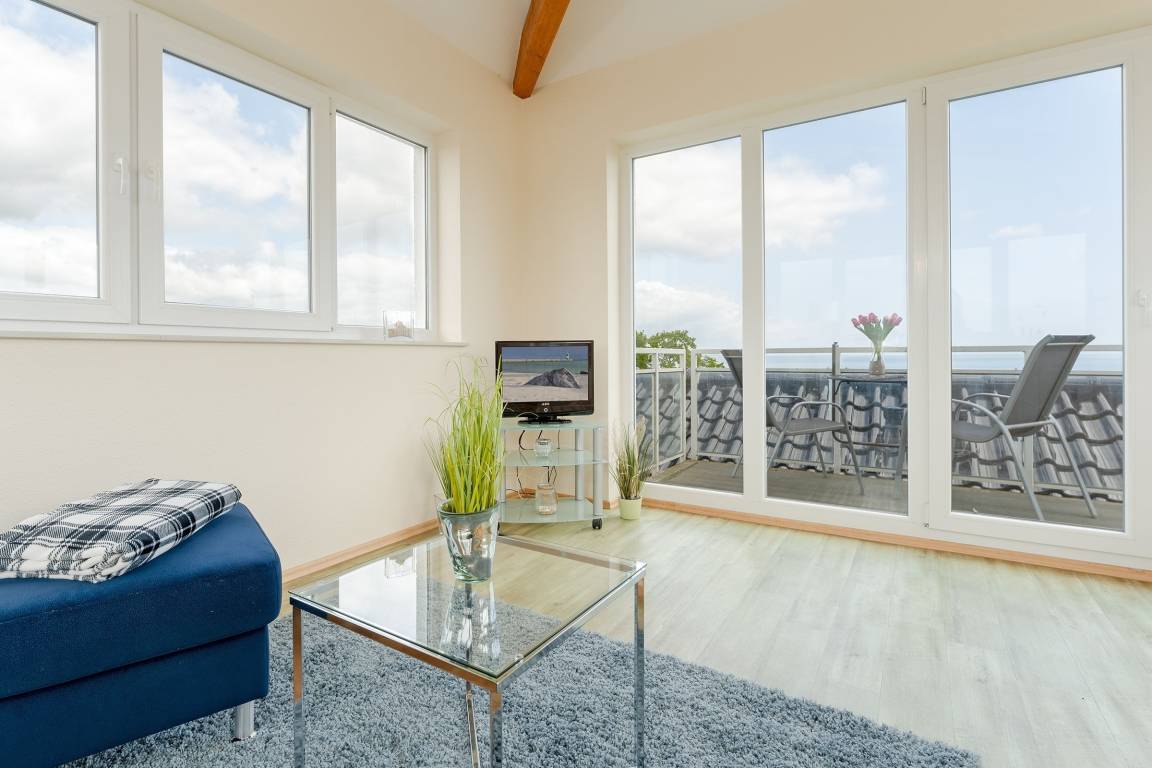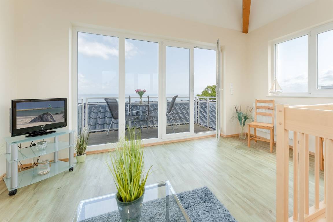 In der unteren Ebene im 3. Stock dient im Wohn-/Essbereich ein bequemes Schlafsofa (Liegefläche 185x130 cm) für gemütliche Abende und erholsame Nächte. Für Unterhaltung sorgen Kabel-TV sowie eine Stereoanlage mit Radio/CD- Anschluss. Die gut ausgestattete, offene Küche mit Esstisch ist in den Wohnbereich integriert und begeistert mit Annehmlichkeiten wie Backofen, Ceranherd, Kühlschrank und Spülmaschine. Ein großzügiger, möblierter Balkon mit Südausrichtung und seitlichem Meerblick kann vom Wohnbereich aus direkt betreten werden. Auf dieser Etage befindet sich auch das geschmackvolle Badezimmer mit Eckdusche, WC, beleuchtetem Spiegel und Handtuchheizung. Das separate Schlafzimmer, welches sich im 4. Stock befindet, ist mit einem komfortablen Boxspringbett (ca. 160x200 cm), Kleiderschrank und LCD-TV ausgestattet. Hier gibt es auch ein Gäste-WC und einen weiteren kleinen, südlich ausgerichteten Balkon. Über eine Wendeltreppe geht es schließlich ins Turmzimmer im 5. Stock – mit atemberaubenden Ostseeblick! Ein toller zweiter Wohnbereich mit 2 Sessel, Kabel-TV, Panoramablick und weiterem möblierten Balkon in Richtung Meer und Horizont.