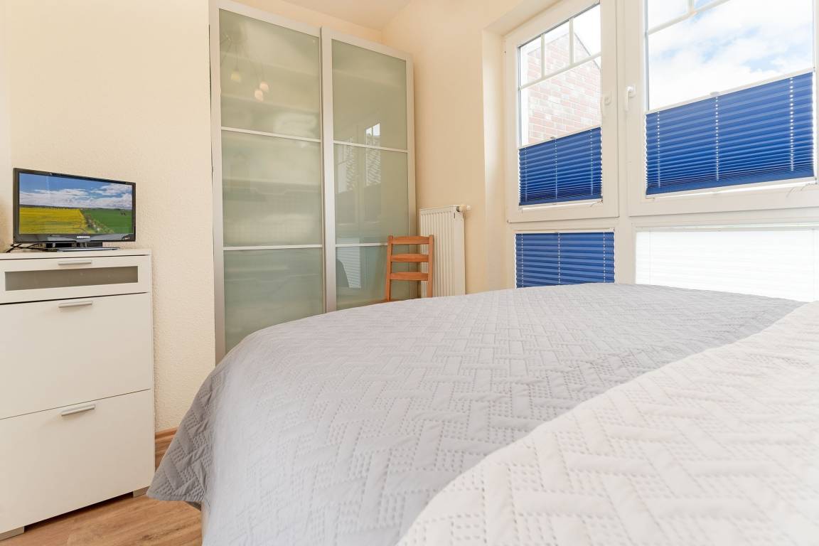 Schlafzimmer (1.OG): 1 Doppelbett (160x200 cm), Kleiderschrank, TV, Lichtschutz (Plissees)