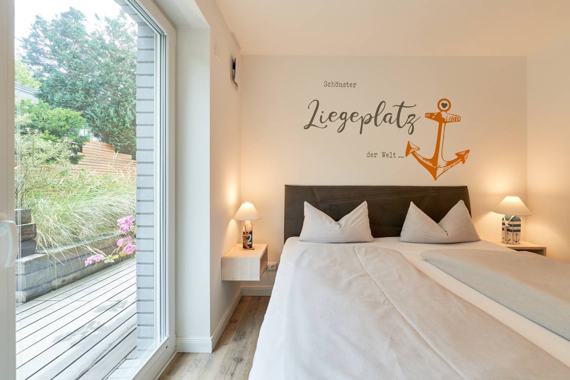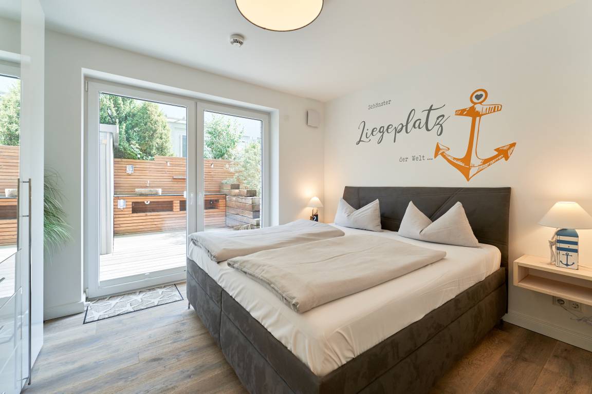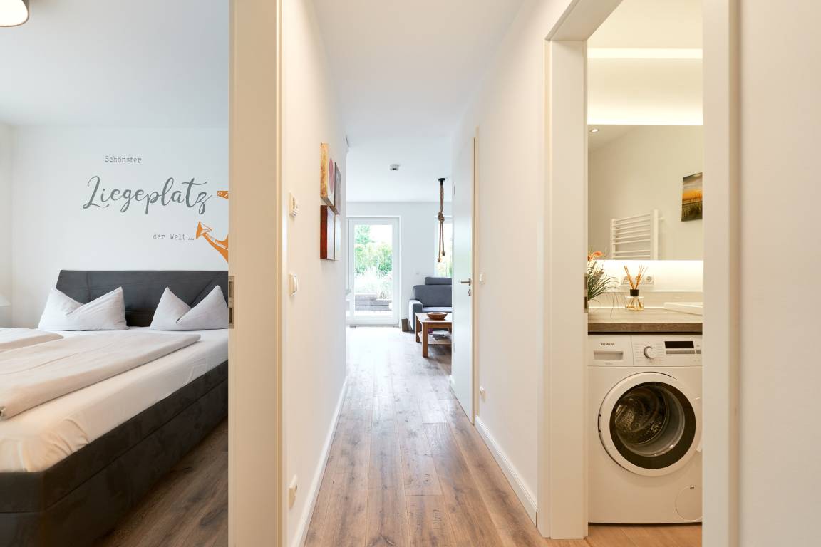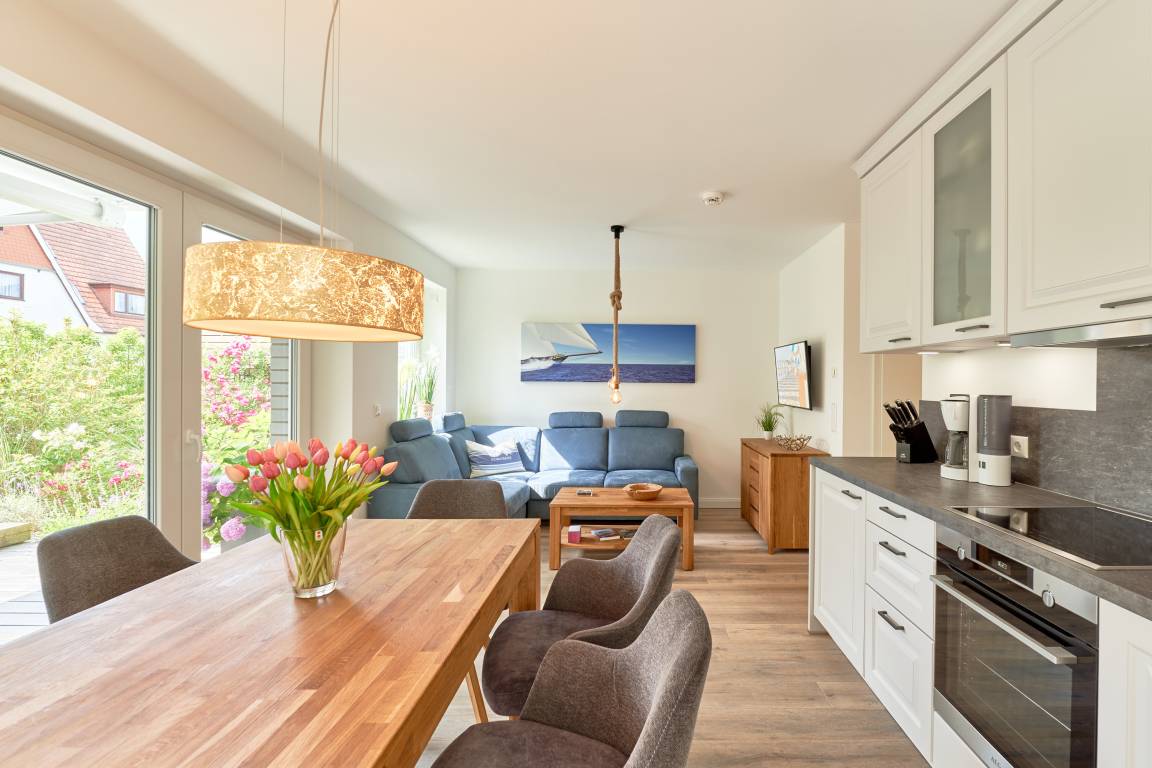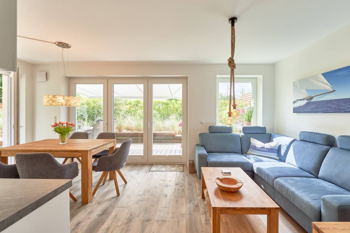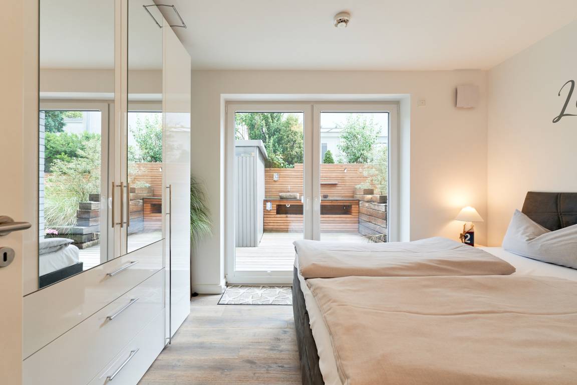 Bereits beim Betreten der Wohnung ist der Wohlfühlcharakter ausgelöst. Der Eingangsbereich ist mit einer bequemen Sitzbank sowie einem Kleiderschrank ausgestattet. Das erste Schlafzimmer ist mit einem Etagenbett eingerichtet, die bodentiefen Fenster lassen Sie auf die schön angelegte Terrasse blicken. Außenrollläden verdunkeln das Zimmer für einen ruhigen Schlaf. Das zweite Schlafzimmer ist mit einem Boxspringbett 180x200 sowie einem Kleiderschrank eingerichtet. Auch hier lassen Sie die bodentiefen Fenster in den sehr schönen Garten blicken. Außenrollläden sorgen auch hier für einen erholsamen Schlaf. Das in heller Optik gehaltene Duschbad hat eine bodentiefe Dusche, einen Handtuchheizkörper sowie eine Waschmaschine. Der Wohn-Essbereich ist großzügig eingerichtet und durch die bodentiefen Fenster mit Süd- und Westausrichtung hell und freundlich. Ein großer Tisch mit bequemen Schalenstühlen bietet ausreichend Platz. Die offene Küche mit weißer Oberfläche ist mit hochwertigen Elektrogeräten ausgestattet: Herd, Backofen, Mikrowelle, Geschirrspüler, Kühl-/Gefrierkombination, Wasserkocher, Toaster, Filterkaffeemaschine. Der Wohnbereich ist bequem und fein ausgestattet. Ein Smart-Flachbildschirm lässt keine Wünsche offen. Per Smartphone direkt via Bluetooth verbinden und eigene Musik hören. Die Terrassen in Süd- und Westlage können nach beiden Seiten vom Wohnzimmer aus betreten werden. Die Sonne begrüßt ihre Gäste zum Mittag und Abend. Ein großer Tisch mit vier Stühlen lädt zu gemütlichen Stunden ein. Eine breite Markise sowie ein Heizstrahler runden das Angebot auf der Terrasse ab.