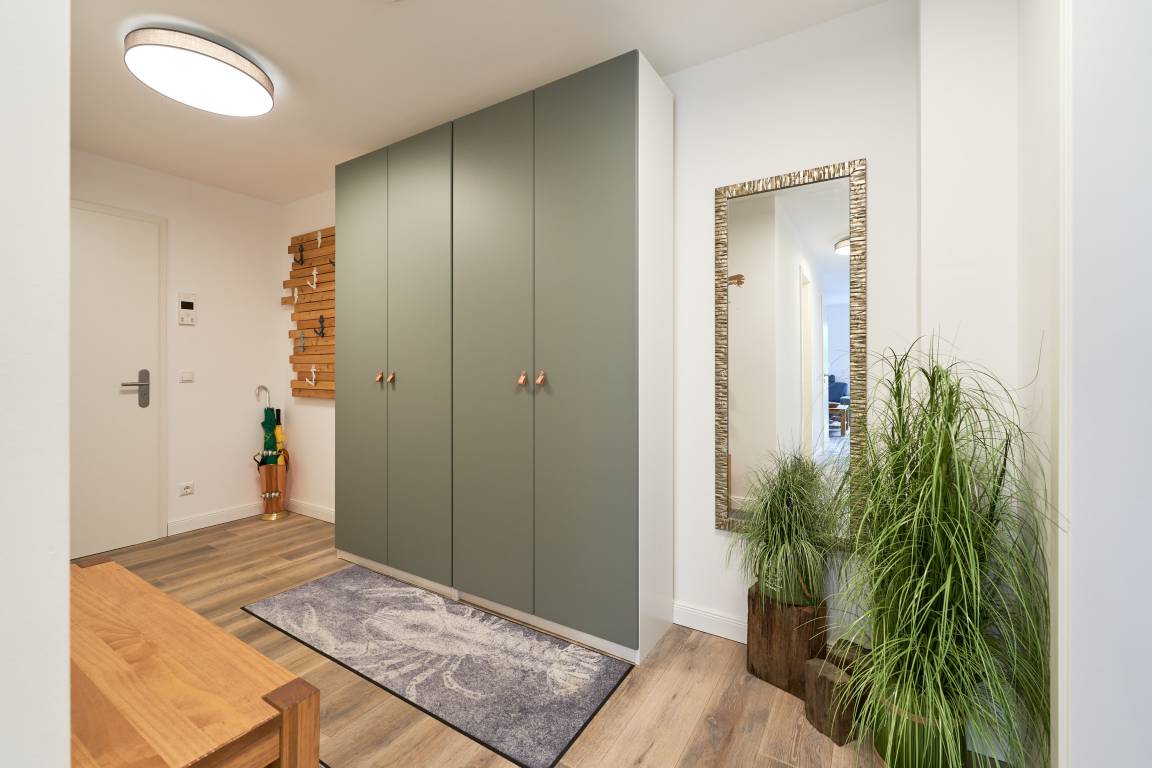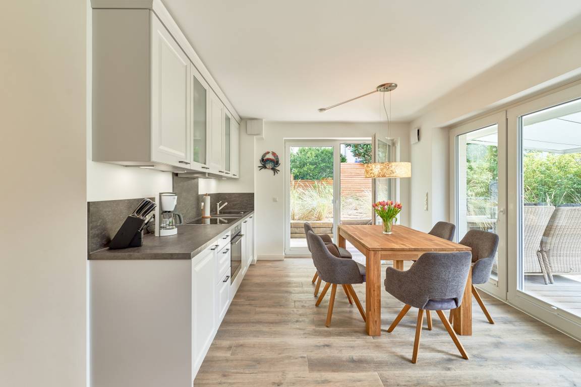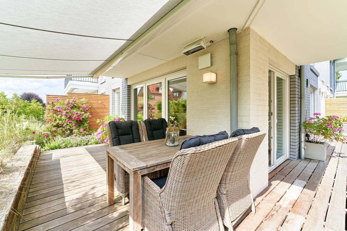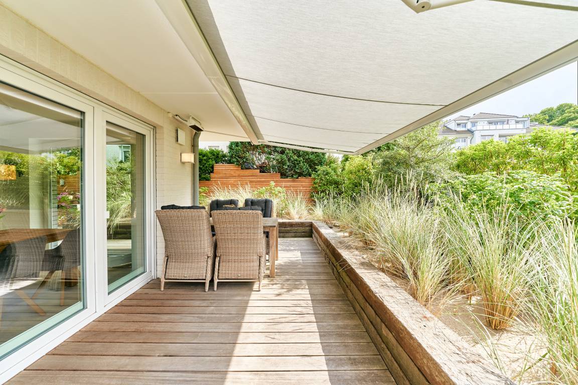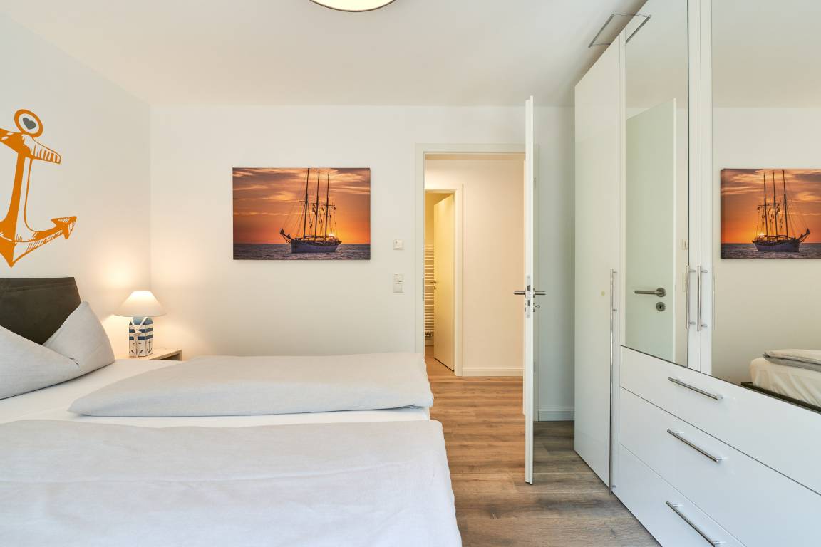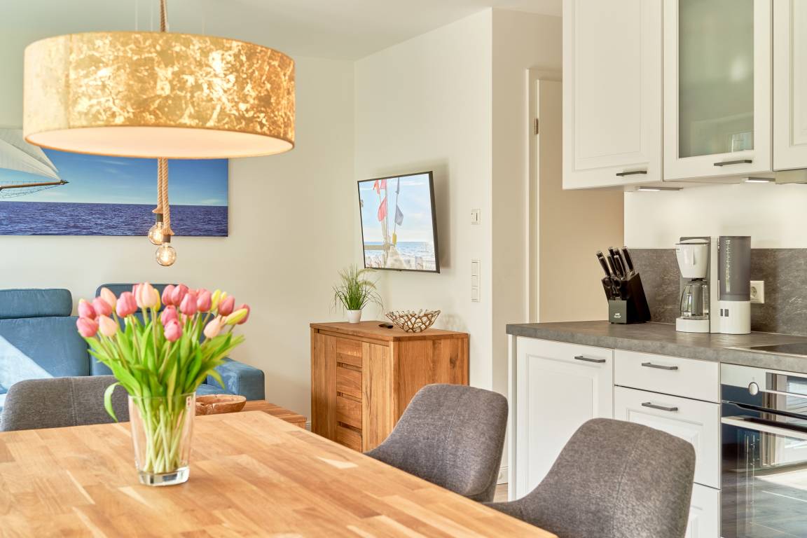 Bereits beim Betreten der Wohnung ist der Wohlfühlcharakter ausgelöst. Der Eingangsbereich ist mit einer bequemen Sitzbank sowie einem Kleiderschrank ausgestattet. Das erste Schlafzimmer ist mit einem Etagenbett eingerichtet, die bodentiefen Fenster lassen Sie auf die schön angelegte Terrasse blicken. Außenrollläden verdunkeln das Zimmer für einen ruhigen Schlaf. Das zweite Schlafzimmer ist mit einem Boxspringbett 180x200 sowie einem Kleiderschrank eingerichtet. Auch hier lassen Sie die bodentiefen Fenster in den sehr schönen Garten blicken. Außenrollläden sorgen auch hier für einen erholsamen Schlaf. Das in heller Optik gehaltene Duschbad hat eine bodentiefe Dusche, einen Handtuchheizkörper sowie eine Waschmaschine. Der Wohn-Essbereich ist großzügig eingerichtet und durch die bodentiefen Fenster mit Süd- und Westausrichtung hell und freundlich. Ein großer Tisch mit bequemen Schalenstühlen bietet ausreichend Platz. Die offene Küche mit weißer Oberfläche ist mit hochwertigen Elektrogeräten ausgestattet: Herd, Backofen, Mikrowelle, Geschirrspüler, Kühl-/Gefrierkombination, Wasserkocher, Toaster, Filterkaffeemaschine. Der Wohnbereich ist bequem und fein ausgestattet. Ein Smart-Flachbildschirm lässt keine Wünsche offen. Per Smartphone direkt via Bluetooth verbinden und eigene Musik hören. Die Terrassen in Süd- und Westlage können nach beiden Seiten vom Wohnzimmer aus betreten werden. Die Sonne begrüßt ihre Gäste zum Mittag und Abend. Ein großer Tisch mit vier Stühlen lädt zu gemütlichen Stunden ein. Eine breite Markise sowie ein Heizstrahler runden das Angebot auf der Terrasse ab.
