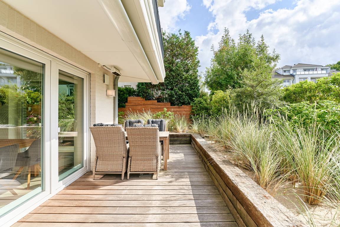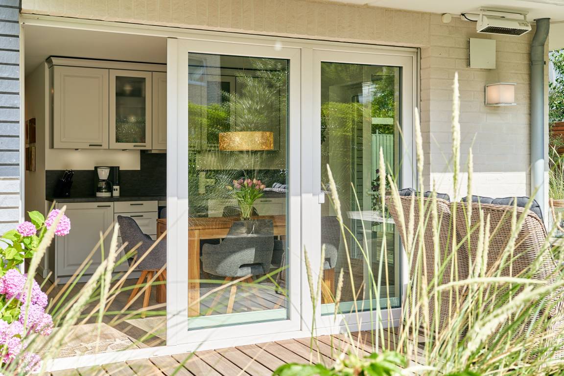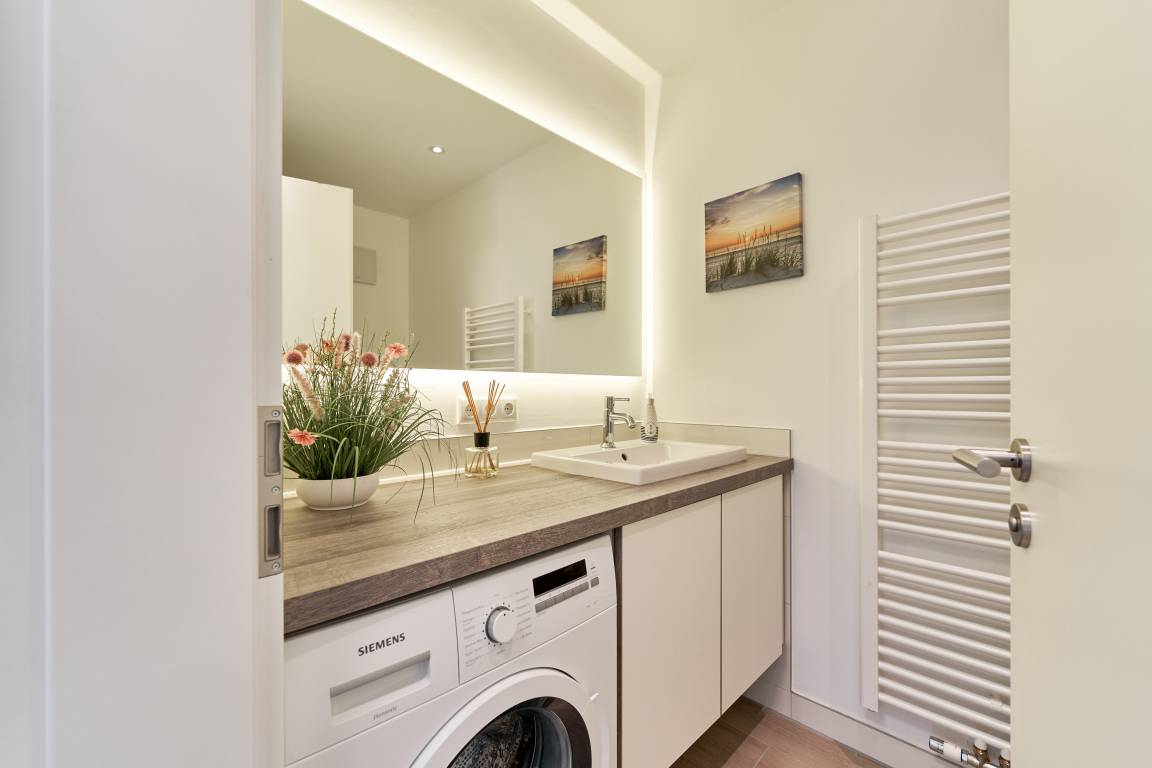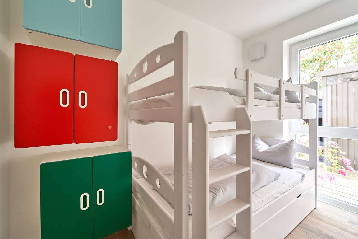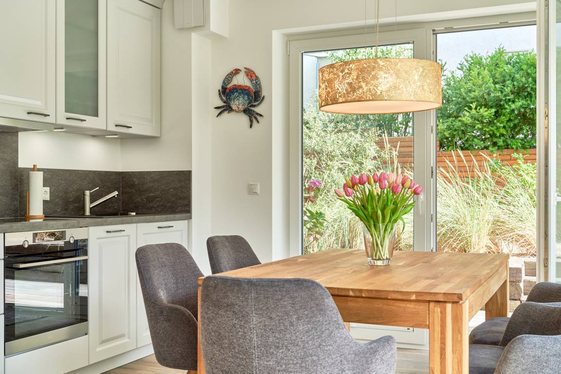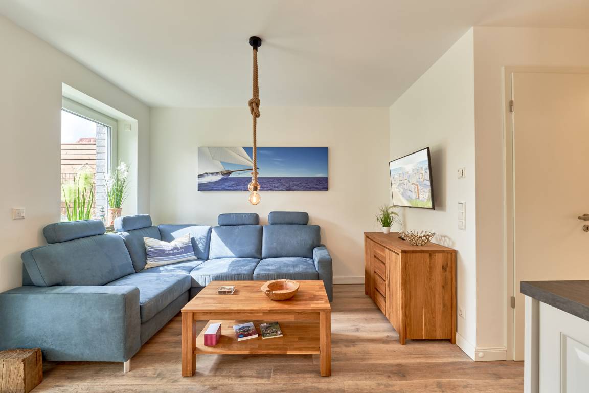Bereits beim Betreten der Wohnung ist der Wohlfühlcharakter ausgelöst. Der Eingangsbereich ist mit einer bequemen Sitzbank sowie einem Kleiderschrank ausgestattet. Das erste Schlafzimmer ist mit einem Etagenbett eingerichtet, die bodentiefen Fenster lassen Sie auf die schön angelegte Terrasse blicken. Außenrollläden verdunkeln das Zimmer für einen ruhigen Schlaf. Das zweite Schlafzimmer ist mit einem Boxspringbett 180x200 sowie einem Kleiderschrank eingerichtet. Auch hier lassen Sie die bodentiefen Fenster in den sehr schönen Garten blicken. Außenrollläden sorgen auch hier für einen erholsamen Schlaf. Das in heller Optik gehaltene Duschbad hat eine bodentiefe Dusche, einen Handtuchheizkörper sowie eine Waschmaschine. Der Wohn-Essbereich ist großzügig eingerichtet und durch die bodentiefen Fenster mit Süd- und Westausrichtung hell und freundlich. Ein großer Tisch mit bequemen Schalenstühlen bietet ausreichend Platz. Die offene Küche mit weißer Oberfläche ist mit hochwertigen Elektrogeräten ausgestattet: Herd, Backofen, Mikrowelle, Geschirrspüler, Kühl-/Gefrierkombination, Wasserkocher, Toaster, Filterkaffeemaschine. Der Wohnbereich ist bequem und fein ausgestattet. Ein Smart-Flachbildschirm lässt keine Wünsche offen. Per Smartphone direkt via Bluetooth verbinden und eigene Musik hören. Die Terrassen in Süd- und Westlage können nach beiden Seiten vom Wohnzimmer aus betreten werden. Die Sonne begrüßt ihre Gäste zum Mittag und Abend. Ein großer Tisch mit vier Stühlen lädt zu gemütlichen Stunden ein. Eine breite Markise sowie ein Heizstrahler runden das Angebot auf der Terrasse ab.