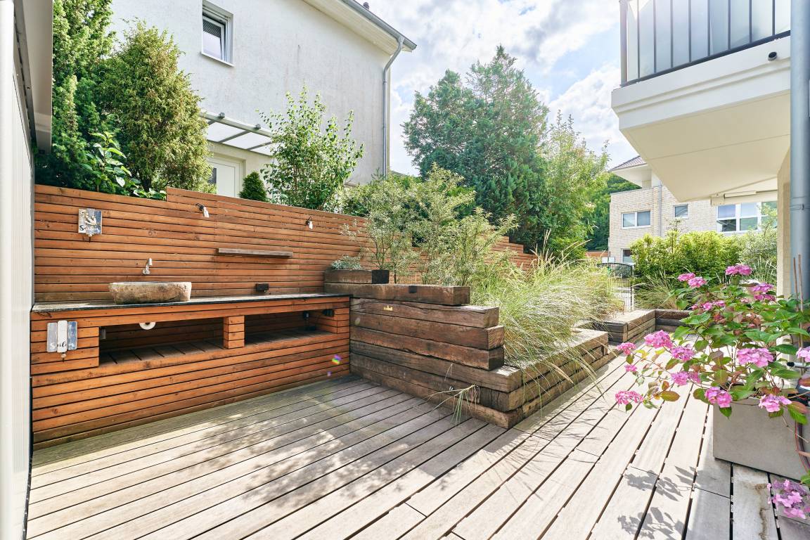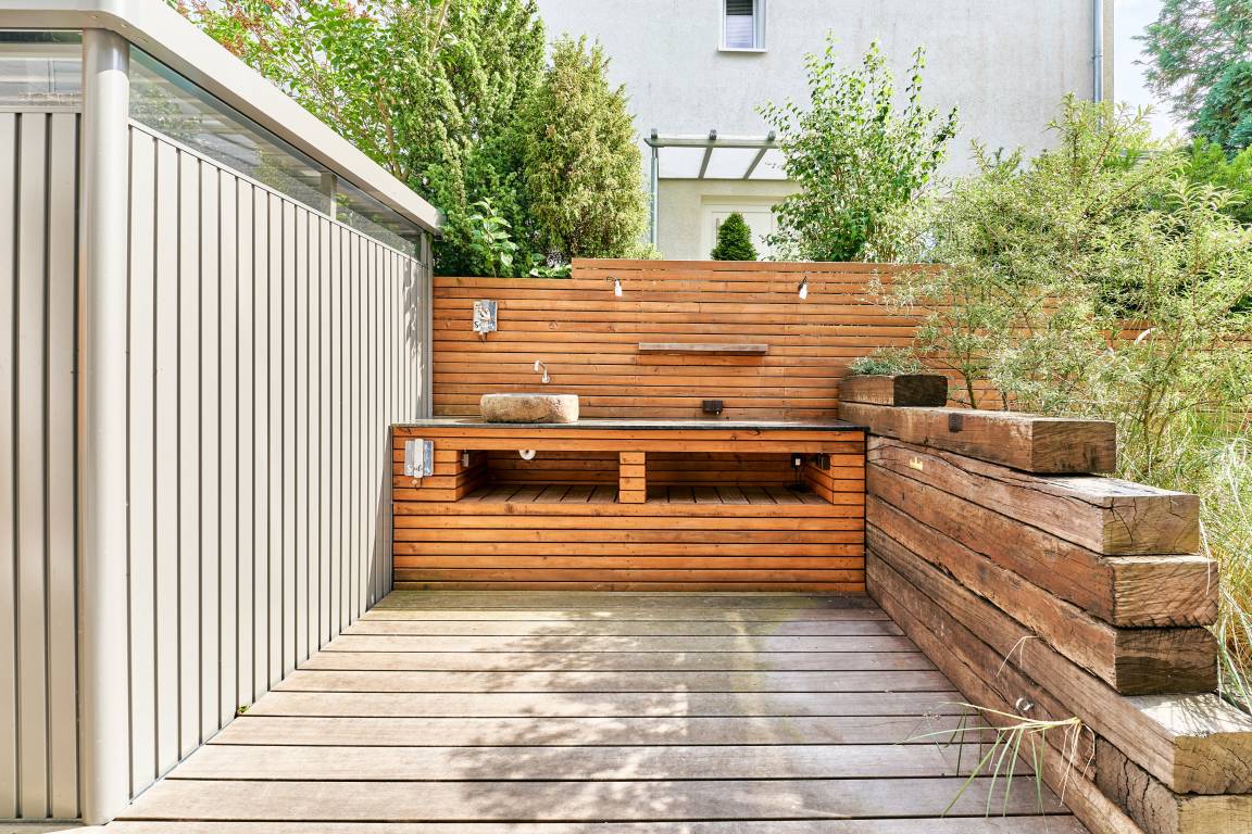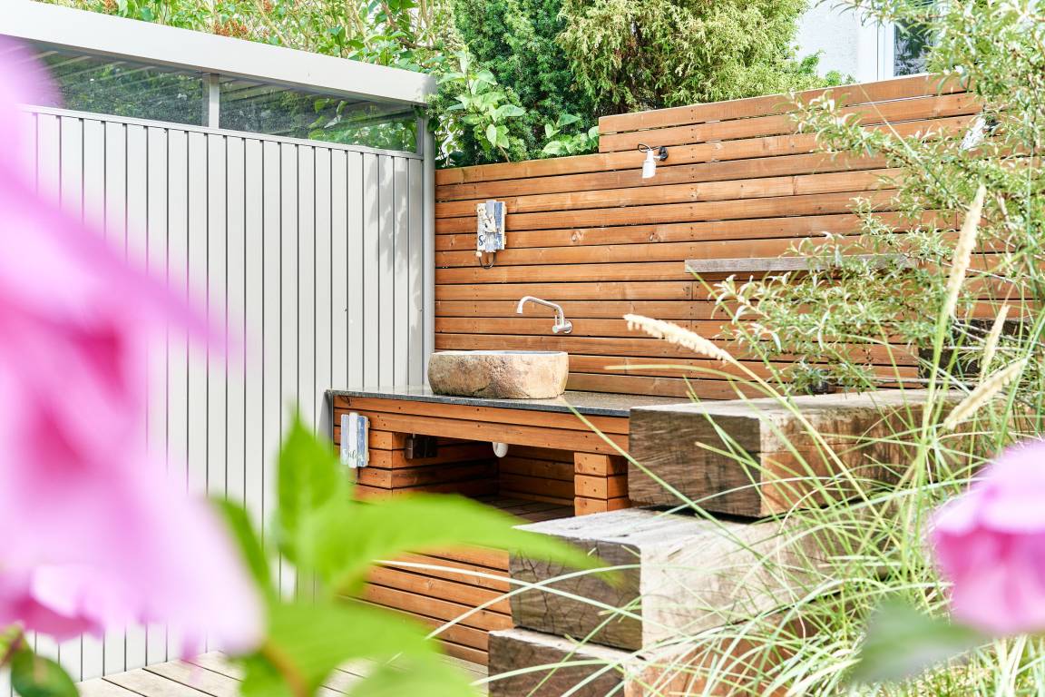 Es wartet eine Out-Door-Küche auf der Süd-Terrasse auf Sie: Hier können Sie z. B. Gemüse, Fleisch und Obst waschen und zum Kochen vorbereiten.