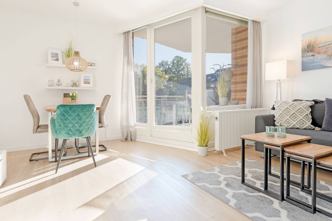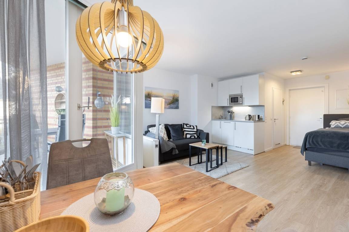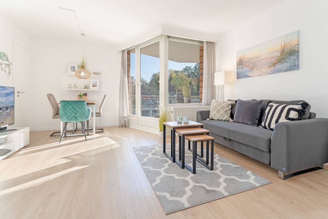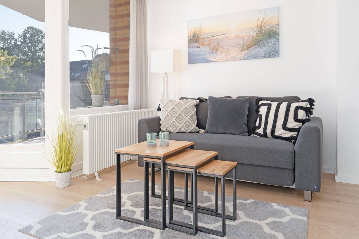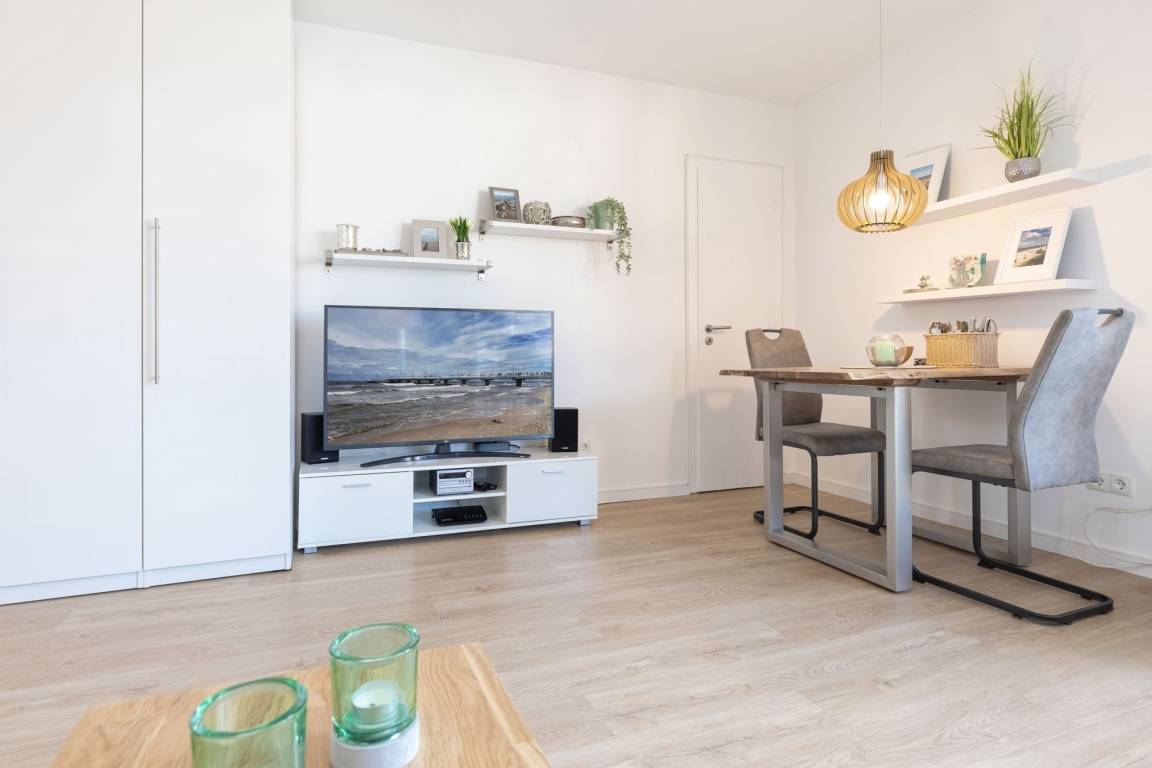 Der offene Wohn-/Koch- und Schlafbereich ist liebevoll eingerichtet. Ein gemütliches Sofa lädt sowohl zum Kuscheln vor dem Fernseher, als auch zum Schlafen ein, denn in nur wenigen Handgriffen verwandeln Sie es in eine bequeme Schlafstätte (ca. 140x200 cm). Im komfortablen Boxspringbett (160x200 cm) ruhen Sie sich nach langen Strandspaziergängen aus. In der Küchenzeile bereiten Sie sich mühelos ein leckeres Frühstück zu und auch einfache Gerichte sind schnell gezaubert. Genießen Sie die gemeinsamen Mahlzeiten am Esstisch oder direkt auf dem möblierten Balkon mit seitlichem Meerblick - hier können Sie tief durchatmen und von dem beruhigenden Rauschen der Wellen den Alltag vergessen. Abgerundet wird diese tolle Ferienwohnung durch das schöne Tageslichtduschbad.