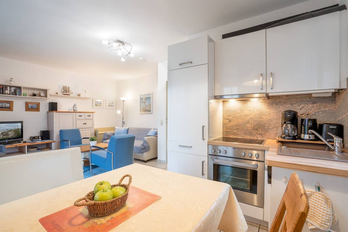 Das Schlafzimmer ist mit einem Boxspringbett (180x200 cm) und einem geräumigen Kleiderschrank ausgestattet. Der Wohnraum verfügt über eine sehr komfortable Schlafcouch (140x210 cm), einem TV-Gerät mit SAT-Empfang und einer Stereoanlage. Ein gemütlicher Essplatz grenzt an die integrierte und hochwertige Küchenzeile, die mit Alltagshelfern wie Geschirrspülmaschine, Backofen, Kühlschrank mit Gefrierfach, Cerankochfeld, Kaffeemaschine, Wasserkocher und Toaster ausgestattet ist. Die großzügige Südterrasse ist mit Gartenmöbeln, 2 Liegen und einem großen Sonnenschirm möbliert. Das tageslichthelle Bad überzeugt mit geschmackvollen Annehmlichkeiten wie Dusche mit tiefem Einstieg, Handtuchheizung und beleuchtetem Spiegelschrank.