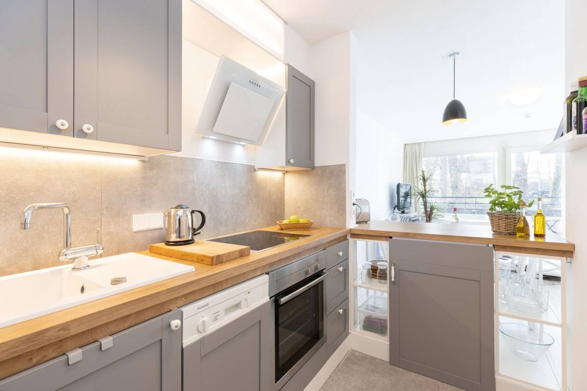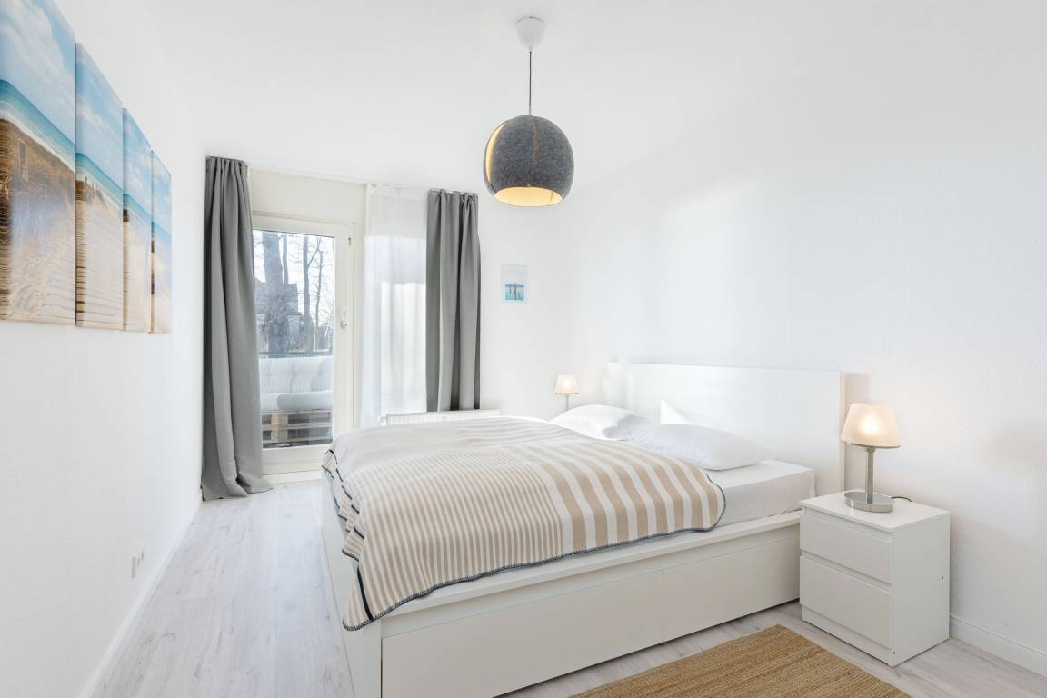Vom Flur aus gelangen Sie in den maritimen Wohnbereich mit gemütlicher Schlafcouch (160x200 cm), TV und einem Essplatz, an dem Sie gemeinsam Ihre Mahlzeiten einnehmen können. Die angrenzende Küche ist mit allen Annehmlichkeiten ausgestattet. Über den Tresen zwischen Küche und Wohnzimmer kann alles bequem zum Esstisch gereicht oder zusätzlich abgestellt werden. Geruhsame Nächte verspricht das helle Schlafzimmer mit Doppelbett (2 x90x200cm). Vom Wohnbereich sowie vom Schlafzimmer aus gelangen Sie auf den Balkon und können den seitlichen Blick auf die schöne Ostsee genießen.