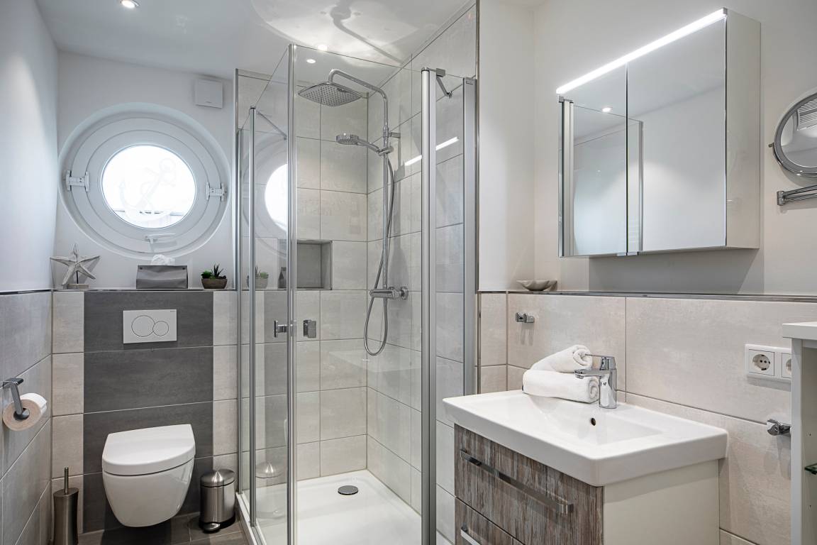 Helles Schlafzimmer, ausgestattet mit einem Boxspringbett von "Schlaraffia" (1,80 x 2,00m) zwei Nachttischen, einem Kleiderschrank sowie einem TV (40" = 100 cm). Außenrollläden lassen Sie im Dunkeln schlafen. Ein Duschbad mit Dusche, Hand- und Regendusche, Handtuchheizkörper, Fön, Kosmetikspiegel.