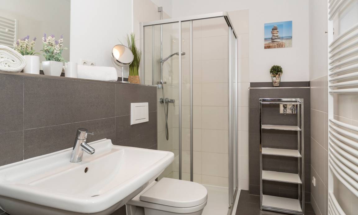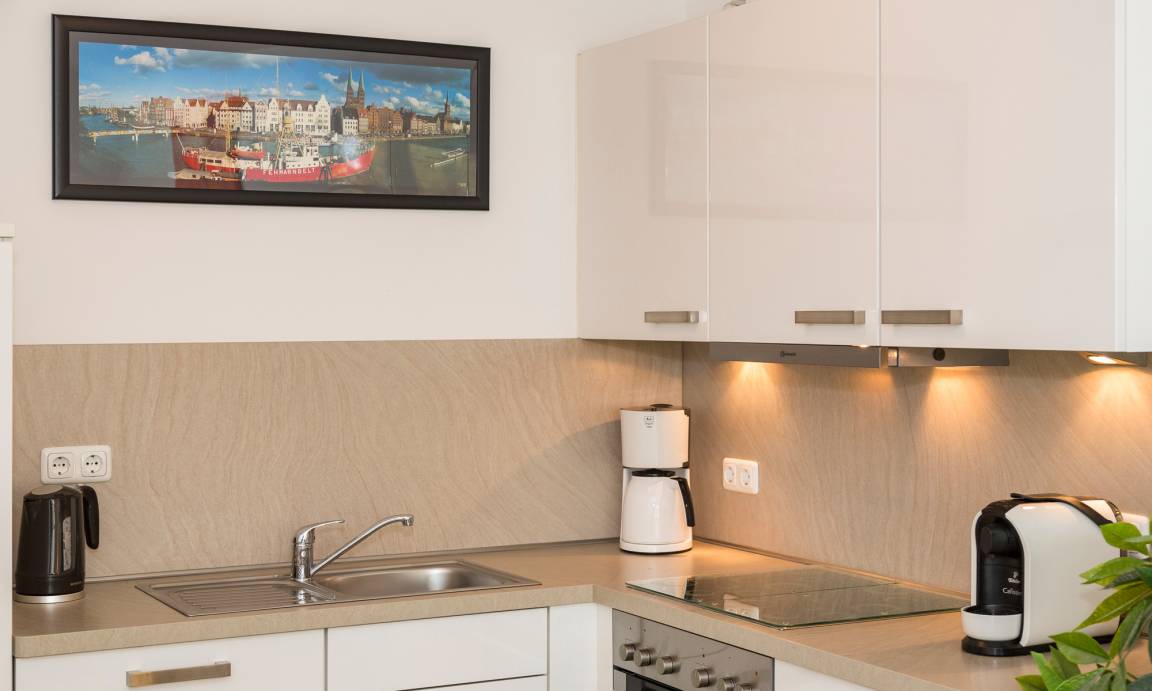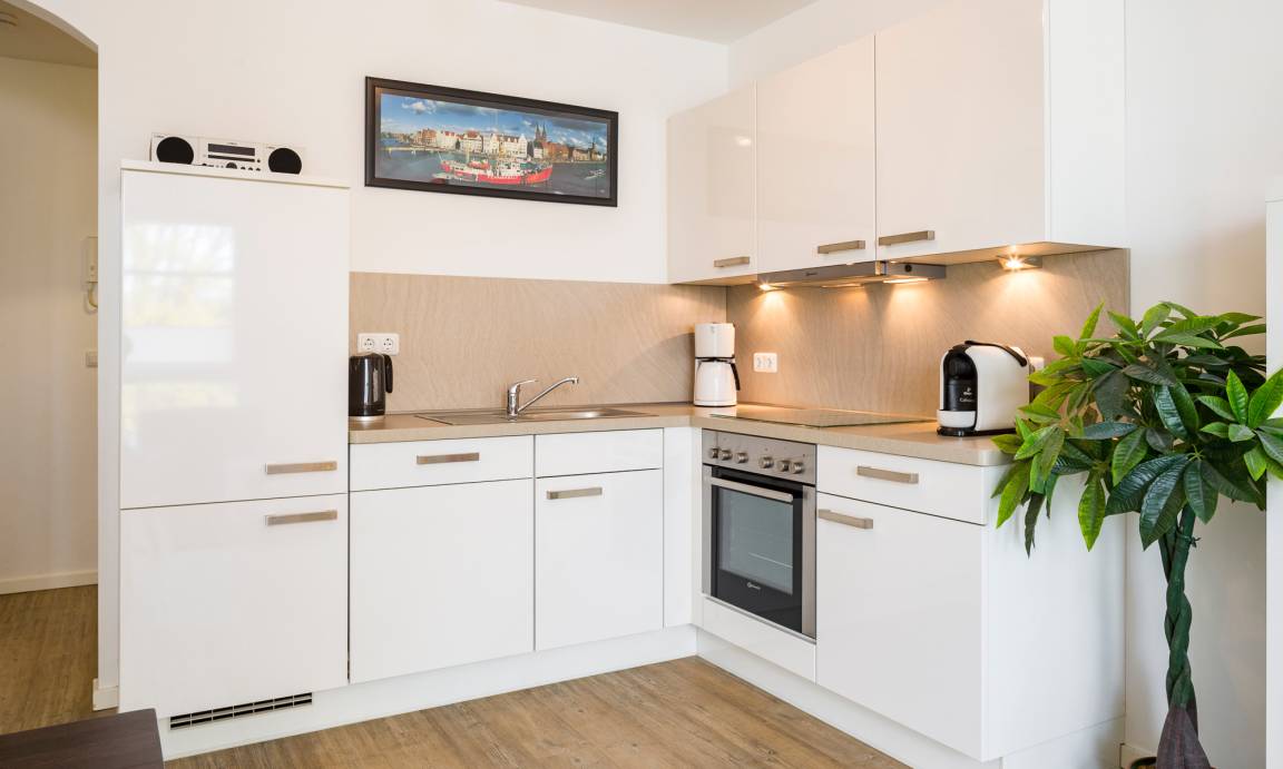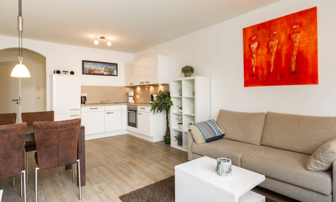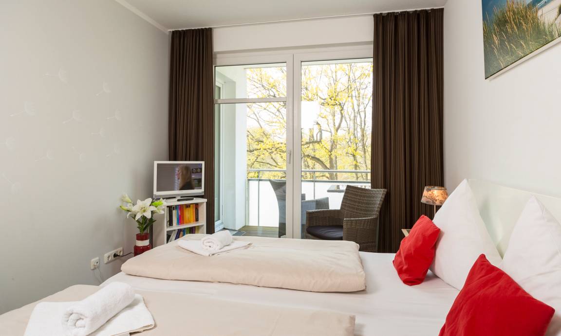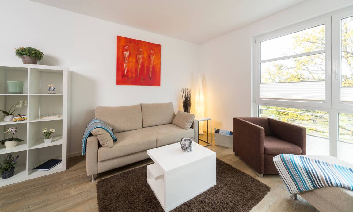 Der Wohn-Essbereich mit bodentiefen Fenstern ist mit einem Esstisch und einer gemütlichen Couch ausgestattet. Mit nur wenigen Handgriffen lässt sich diese in eine Schlafcouch verwandeln. Neben einem Smart-TV und DAB-Radio steht Ihnen selbstverständlich kostenloses WLAN zur Verfügung. Der überdachte Balkon mit Blick in den Kurpark ist mit einem Tisch und Stühlen ausgestattet. Die moderne Küche lässt keine Wünsche offen. Im Schlafzimmer befinden sich ein bequemes Doppelbett (1,80 x 2,00m, Einzelmatratzen) sowie ein geräumiger Kleiderschrank. Das Badezimmer verfügt über eine bodentiefe Dusche. Neben der Fußbodenheizung ist hier ein zusätzlicher Handtuchheizkörper angebracht.