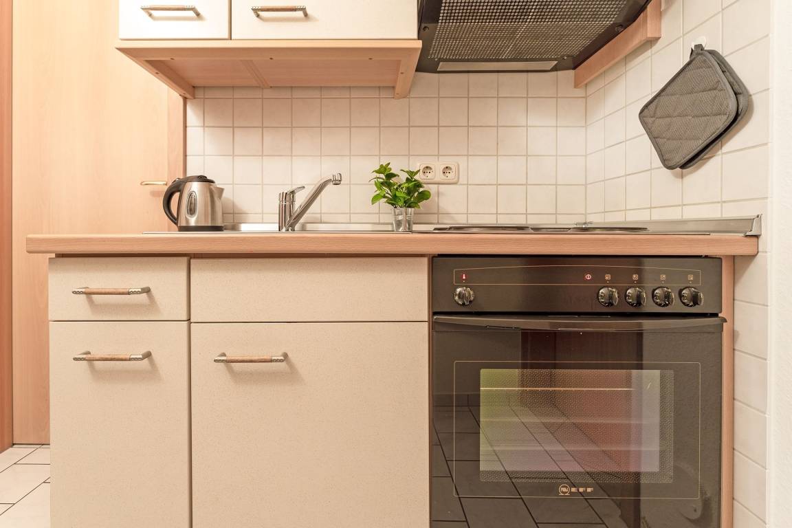 Das 1-Zimmer Appartement ist ausgestattet mit einem Doppelbett (140x200 cm) sowie einem gemütlichen Esstisch für 2 Personen. Das gemütliche 2-Sitzer-Sofa und der Flachbildfernseher laden zu kuscheligen Abenden ein. Die separate Küche mit Fenster, Backofen, Gefrierfach, Herd, Kaffeemaschine, Mikrowelle, Toaster und Wasserkocher ist voll ausgestattet und lädt dazu ein leckere Gerichte zu kreieren. Von hier gelangen Sie in das tageslicht-Bad mit Dusche und WC.