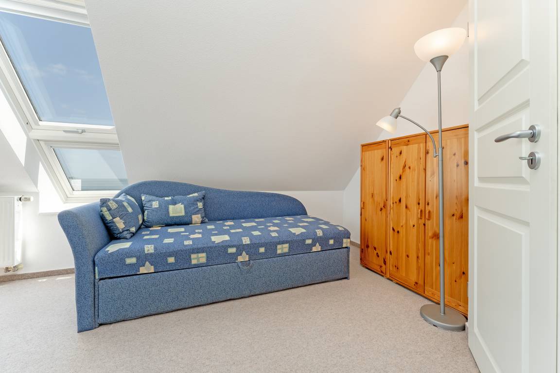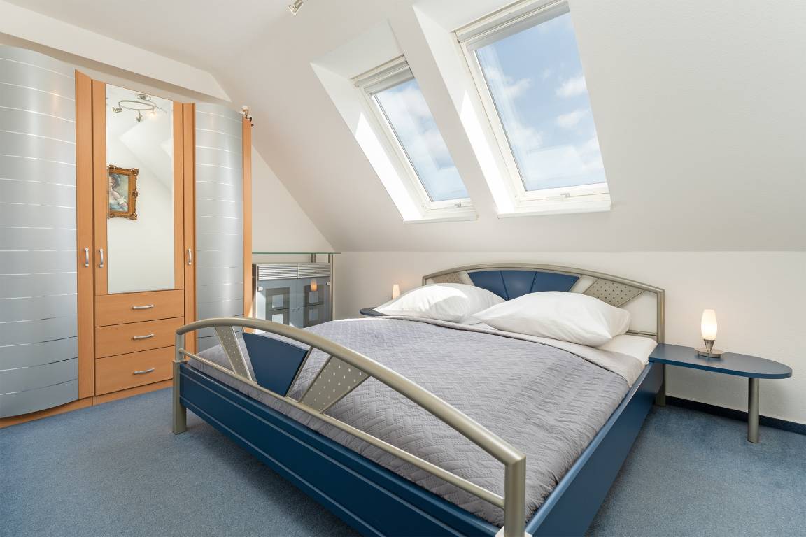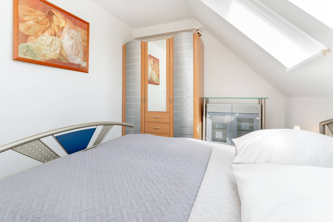 Schlafzimmer 2 (4. OG): 1 Doppelbett (180x200 cm), Kleiderschrank, Verdunkelung: Rollo, Platz für ein Babybett vorhanden