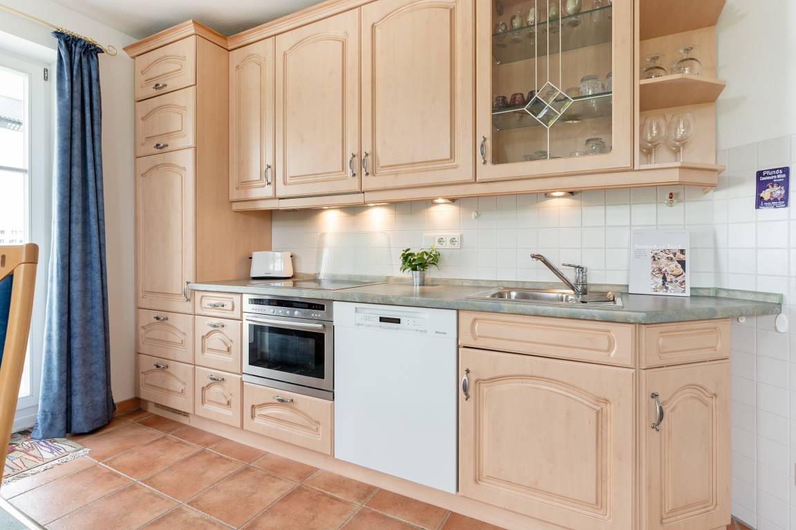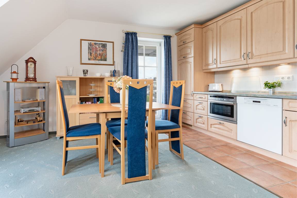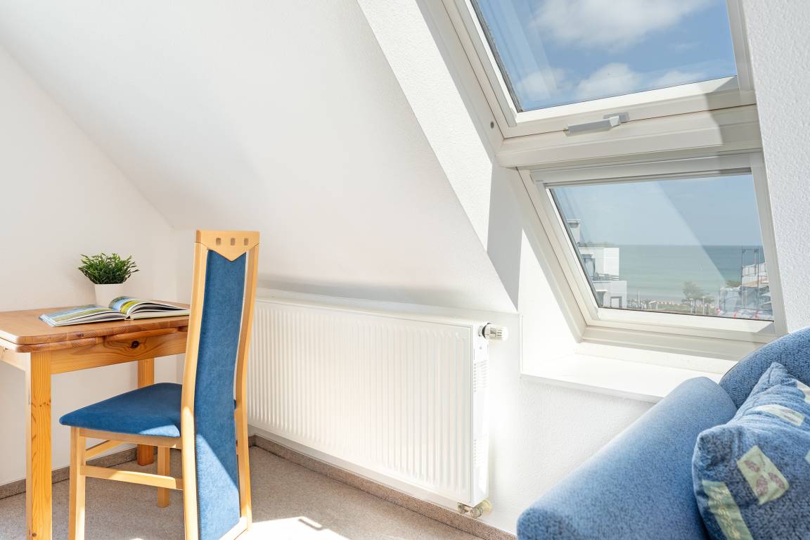 Diese stilvolle Ferienwohnung in der dritten Etage bietet Ihnen alles, was Sie für einen erholsamen Urlaub an der Ostsee benötigen – inklusive herrlichem Meerblick und großzügigem Balkon mit Südwestausrichtung. Im lichtdurchfluteten Wohnbereich erwarten Sie bequeme Sitzgelegenheiten, zwei TVs, CD-Player, Radio und WLAN. Große Fenster sorgen für eine freundliche Atmosphäre und erlauben Ihnen einen traumhaften Blick auf die Ostsee. Der angrenzende, überdachte Balkon lädt mit Gartenmöbeln zum Verweilen in der Sonne ein – perfekt für entspannte Stunden mit einem guten Buch. Die offene Küche ist bestens ausgestattet mit Ceranherd, Backofen, Mikrowelle, Kühlschrank mit Gefrierfach, Kaffeemaschine, Wasserkocher, Toaster, Eierkocher und Mixer. Am Esstisch findet die ganze Familie Platz. Zwei separate Schlafzimmer garantieren ruhige Nächte – beide Schlafzimmer verfügen über Doppelbetten (140x200 cm und 180x200 cm). Im Badezimmer finden Sie eine Dusche mit Wanne, Waschbecken, WC, Kosmetikspiegel sowie Haartrockner.