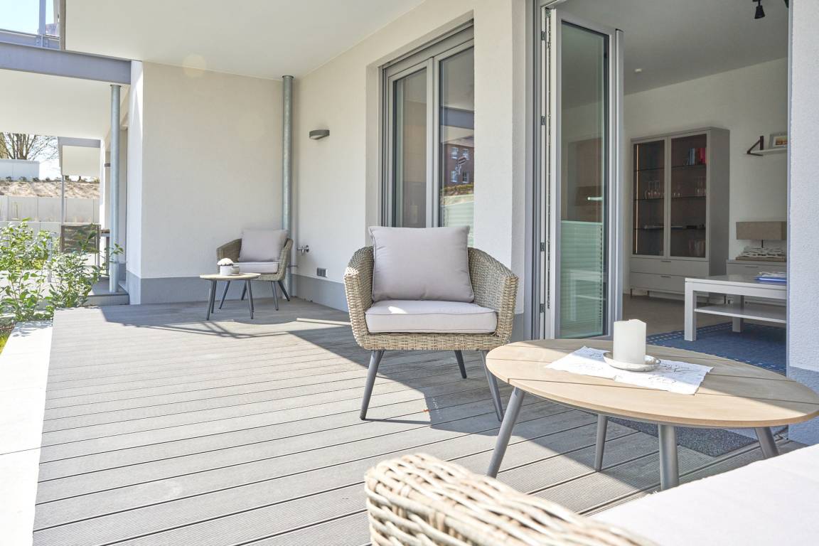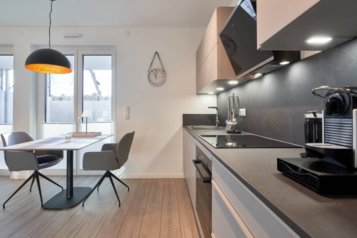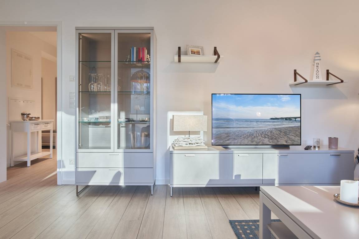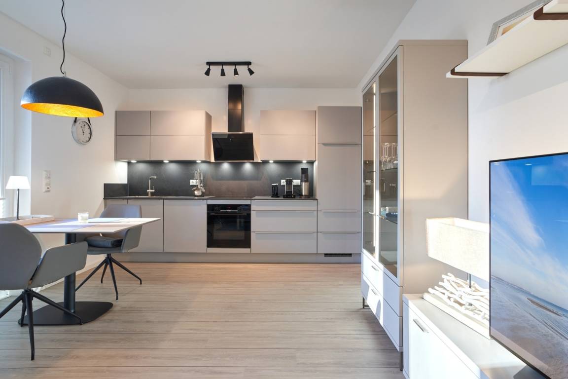 Lichtdurchflutetes Wohnzimmer durch die bodentiefen Fenster, die mit einem Licht- und Sichtschutz versehen sind. Außenrollläden im Wohnzimmer. Hochwertige Einbauküche mit Induktionsherd, Backofen, Kühlschrank mit Gefrierfach, Geschirrspüler, Toaster, Wasserkocher, Eierkocher, Elektro-Tischgrill, Sodastreamer, Espressomaschine, Nespresso-Kaffeemaschine mit Milchaufschäumer. Feiner Essbereich. Der Wohnbereich ist mit einem bequemen Sofa( läßt sich mit wenigen Handgriffen in ein Schlafsofa verwandeln), einem Wohnzimmertisch, einem TV (48 Zoll) sowie einem Internetradio ausgestattet. Aus dem Wohnbereich gelangen Sie auf die Terrasse nach Süden. Hier stehen Ihnen Tisch und zwei Stühle zur Verfügung.