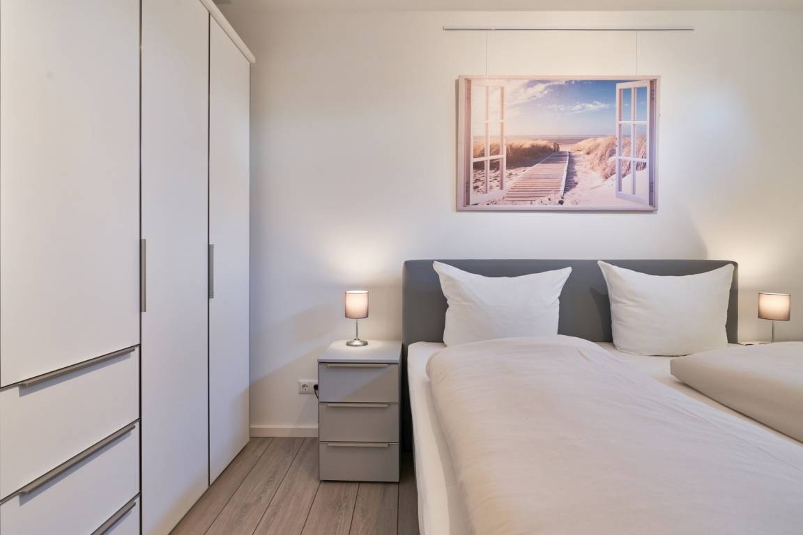 Das Schlafzimmer ist mit einem Boxspringbett (1,80mx2,00m) ausgestattet und verfügt über einen Einbauschrank, 2 Nachttische sowie einen Wand-TV. [nbsp] (43 Zoll). Das Duschbad mit bodengleicher Dusche, Regendusche sowie Handbrause, Handtuchheizkörper, Fön, Kosmetikspiegel. Die ganze Wohnung ist mit einer Fußbodenheizung sowie mit einem Sicht- bzw. Lichtschutz an allen Fenstern ausgestattet.