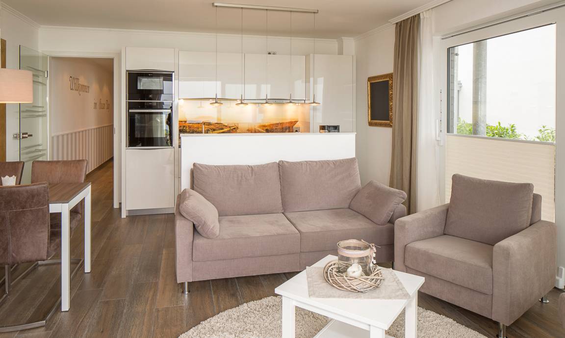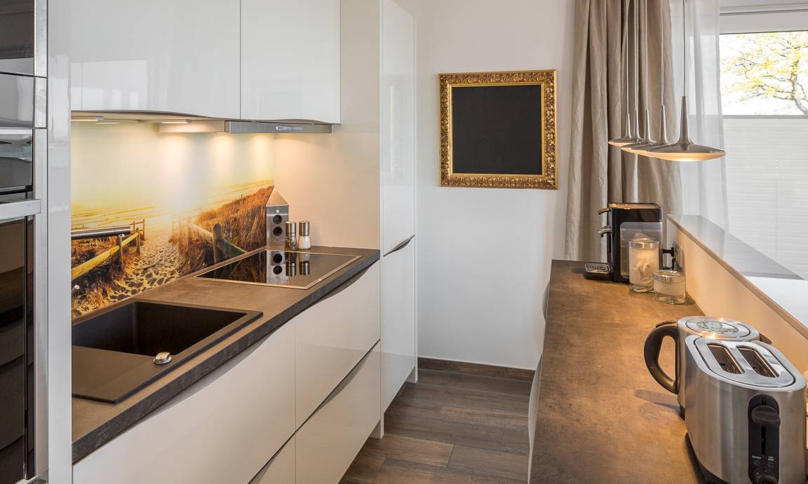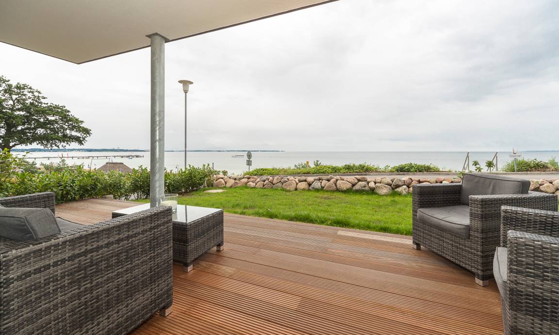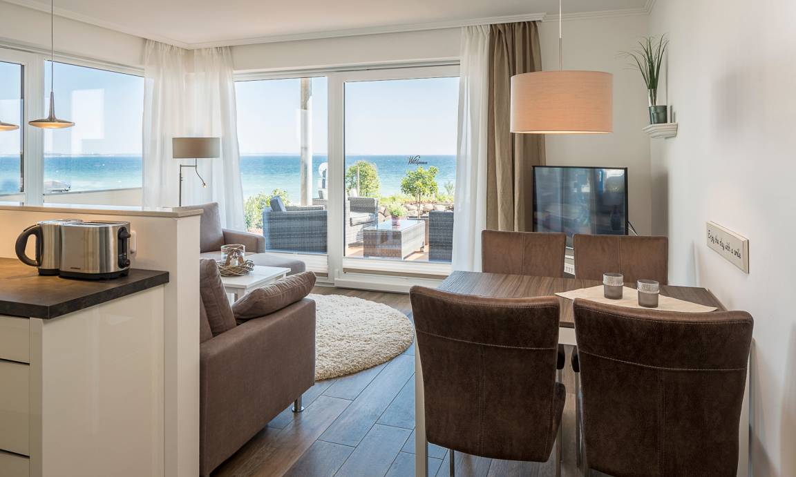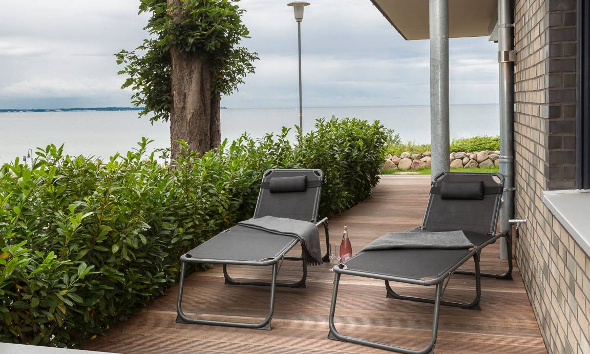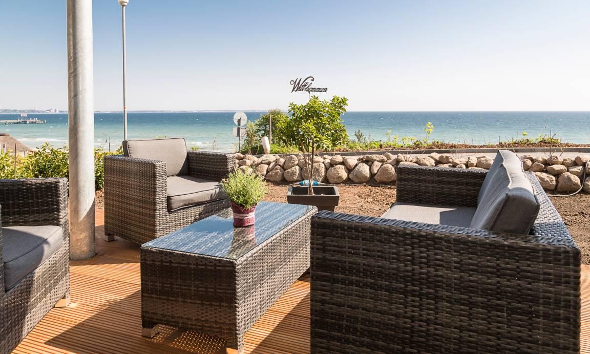 Weitere besondere Komfortmerkmale der Schlafräume sind der jeweilige 40-Zoll-Flach-TV, die Schallschutztüren (SK2) und die Mückenschutznetze vor den Fenstern. Der Mittelpunkt des schönen Wohn-/Essbereichs ist die sehr moderne Rotpunkt-Lackküche, welche mit allen wichtigen Extras ausgestattet ist und keine Wünsche offen lässt. Weitere Wohndetails sind u. a. das komfortable Sofa mit individueller Longchair-Funktion, 48-Zoll-Curved-Flach-TV, Musikanlage sowie ein schöner Essbereich mit ausziehbarem Tisch (1,50m ). Weitere Komfortmerkmale sind sicherlich das große Insektenschutz-Schiebeelement sowie die Sichtschutz verglasten Scheiben (verhindert neugierige Blicke von außen nach innen). Ein weiteres Highlight ist die ca. 40m² große Bankirai-Terrasse mit schöner Sitzlounge sowie dem kleinen Gartenanteil zur alleinigen Nutzung. Der herrliche Blick auf die Lübecker Bucht wird Sie beeindrucken. Gönnen Sie sich einen schönen Urlaub in dieser sehr anspruchsvollen und besonderen Ferienwohnung. Sie haben es sich verdient.