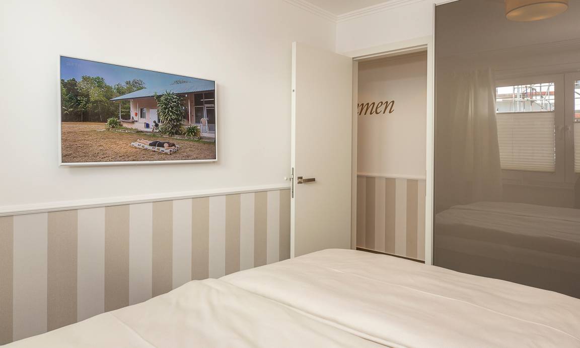 Das Badezimmer bietet Ihnen u. a. einen Doppelwaschtisch, eine bodentiefe Dusche, einen extra Handtuchheizkörper sowie einen großen Design-Spiegelschrank. Weitere Details, wie einen Kosmetikspiegel, einen Föhn, ein Fenster-Mückenschutzgitter und ein integriertes Badradio, runden dieses schöne Bad ab. Die 2 Schlafräume sind ebenfalls sehr hochwertig ausgestattet. Hierbei sind vor allem die exklusiven Schlaraffia-Boxspringbetten (1,80x 2,00m) mit den sehr komfortablen Geltex-Inside-Matratzen für einen erholsamen Schlaf zu erwähnen.