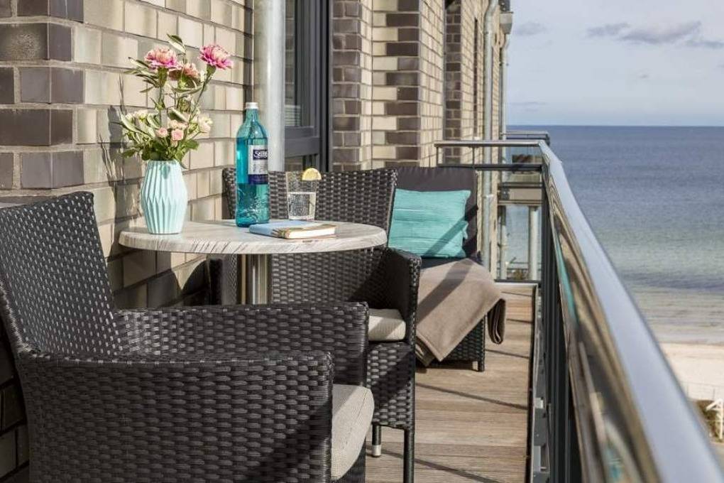 2-Zimmer-Ferienwohnung, ca. 55 m², mit umlaufendem Süd-West-Balkon und Teilmeerblick, Duschbad, Kfz-Außenstellplatz, für bis zu 3 Personen. Entdecken Sie die Ferienwohnung in unserem 360°-Rundgang!