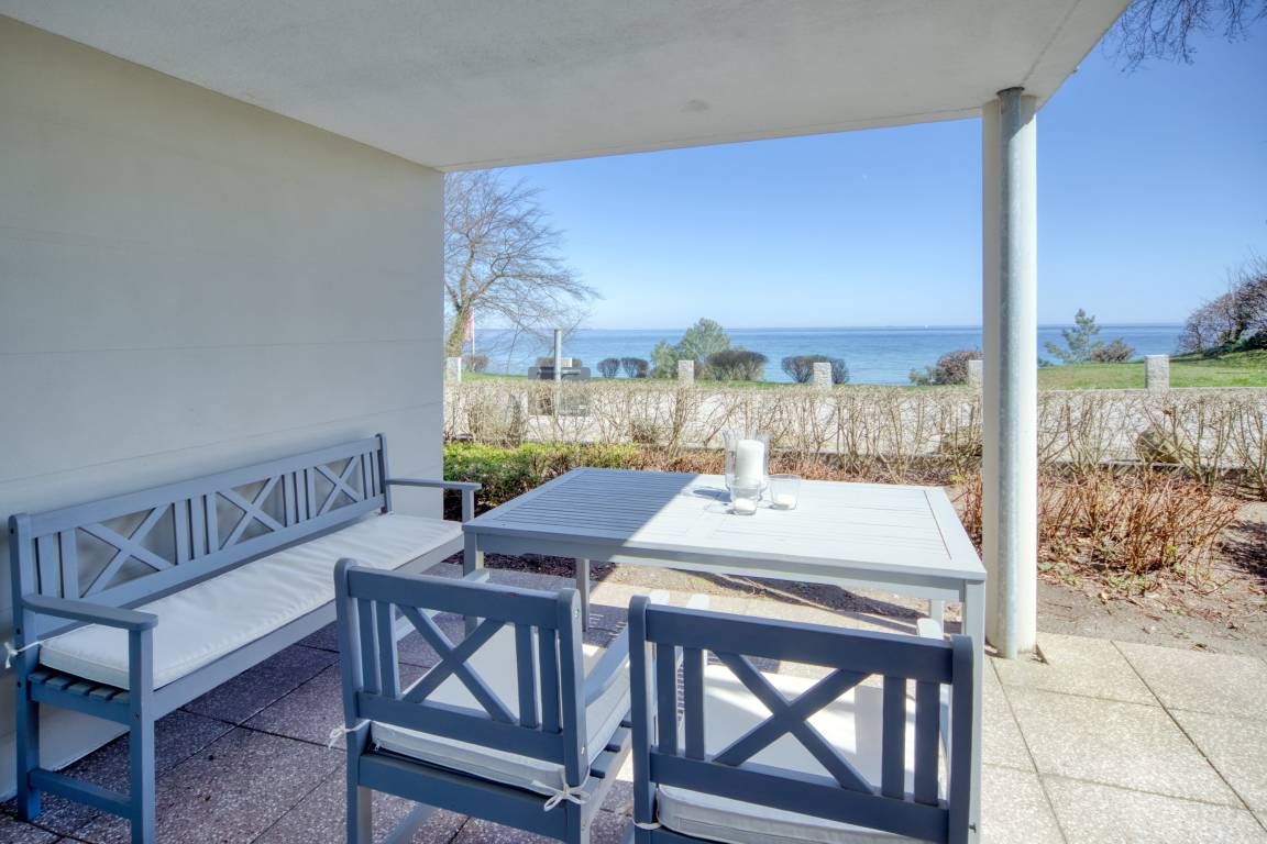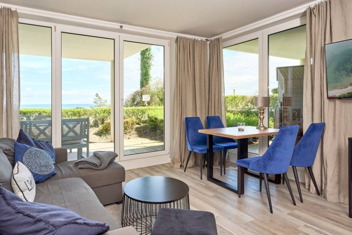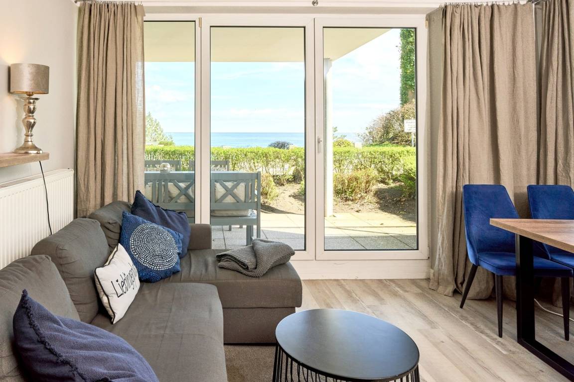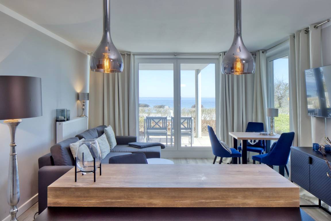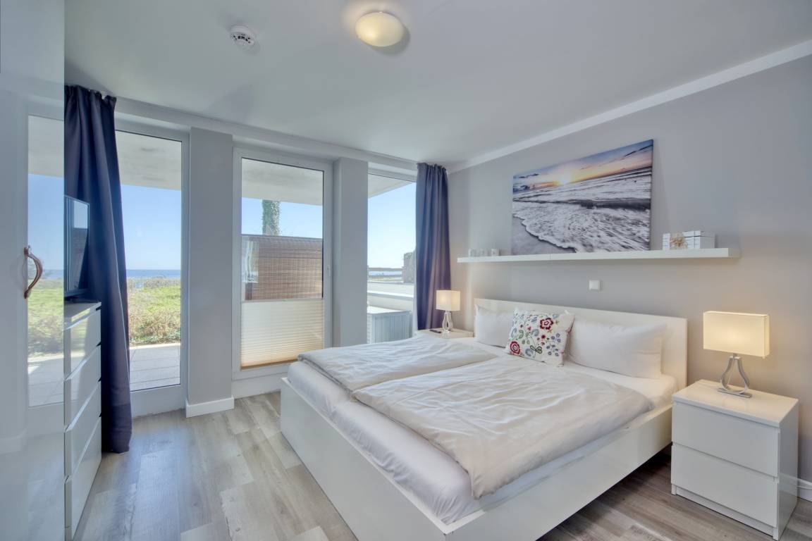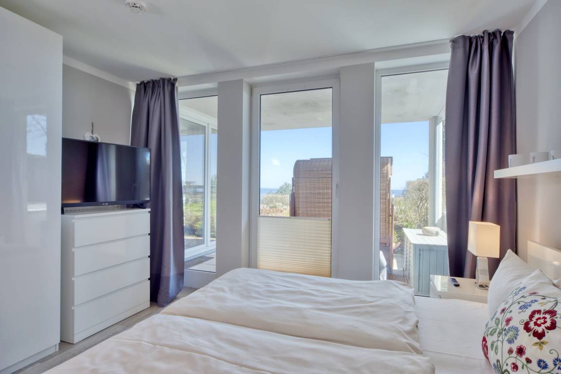 Diese gemütliche 3-Zimmer-Ferienwohnung bietet Ihnen neben dem traumhaften Blick auf die Lübecker Bucht und die Ostsee alles, was Ihr Urlaubsherz begehrt. Der Wohn-Essbereich ist geschmackvoll eingerichtet und verfügt über SAT/Kabel-TV und einen kostenlosen WLAN-Anschluss. Aus dem Wohnzimmer gelangen Sie auf die erste Terrasse Richtung Osten und können den Blick über die Ostsee schweifen lassen. Das gemütliche Schlafzimmer ist mit einem geräumigen Kleiderschrank, einem Boxspringbett