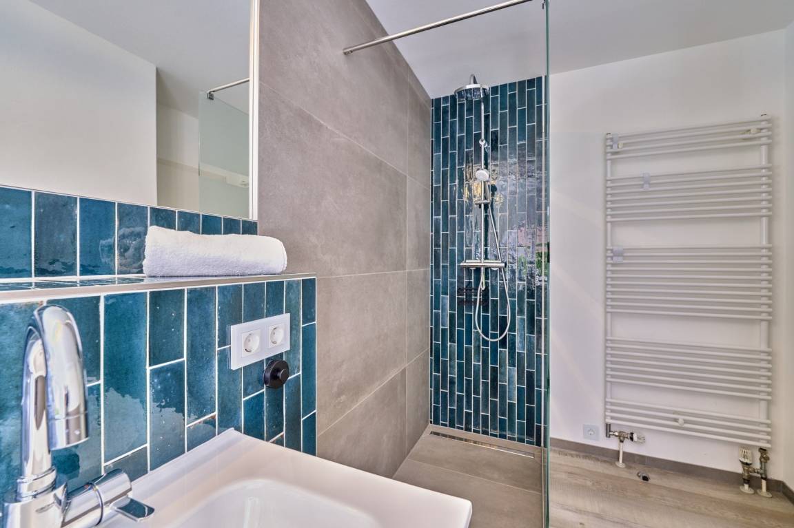 (1,80 x 2,00m) und einem Flachbildfernseher ausgestattet. Von hier erreichen Sie die zweite Terrasse. Ein weiteres Schlafzimmer ist mit einem Doppelbett (1,40 x 2,00m) sowie mit einem TV eingerichtet. Diese Ferienwohnung hat ein großes, tageslichtreiches Bad mit ebenerdiger Dusche und ein separates WC. Im Keller des Hauses befinden sich Waschmaschine und Wäschetrockner, beide sind über einen Münzzähler zu bedienen.