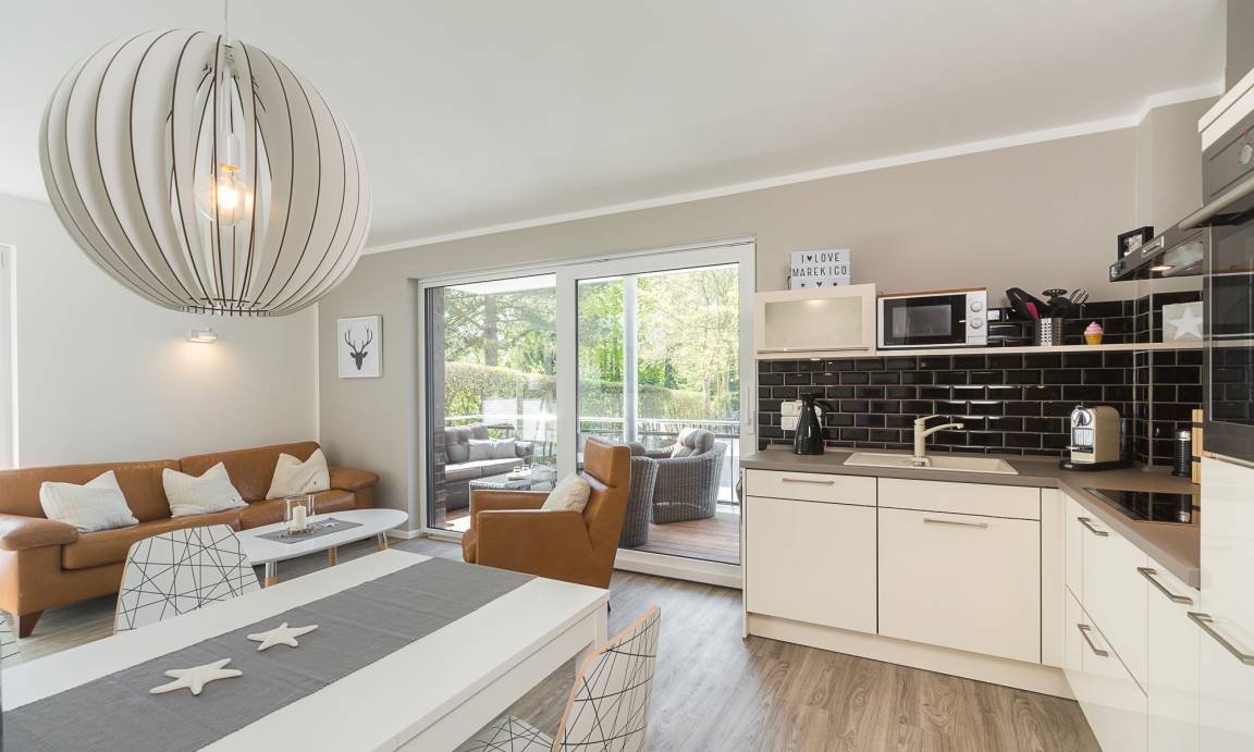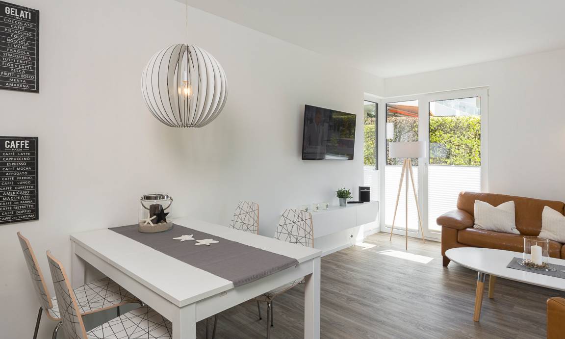 Der moderne Wohn-Essbereich bietet Ihnen eine gemütliche Sofaecke sowie einen großen Esstisch mit Stühlen für gesellige Stunden. Auf der angrenzenden Terrasse nach Westen genießen Sie die Nachmittagssonne. Neben einem Flach-TV, einer Stereoanlage und einem BluRay-Player steht Ihnen selbstverständlich kostenloses WLAN zur Verfügung. Die moderne Küche ist komplett ausgestattet und lässt keine Wünsche offen. Das Bad verfügt über eine bodentiefe Dusche und einen extra Handtuchheizkörper. Das 1. Schlafzimmer ist mit einem Boxspringbett (1,80 x 2,00m), das 2. Schlafzimmer mit zwei Einzelbetten (0,80 x 2,00m) ausgestattet.