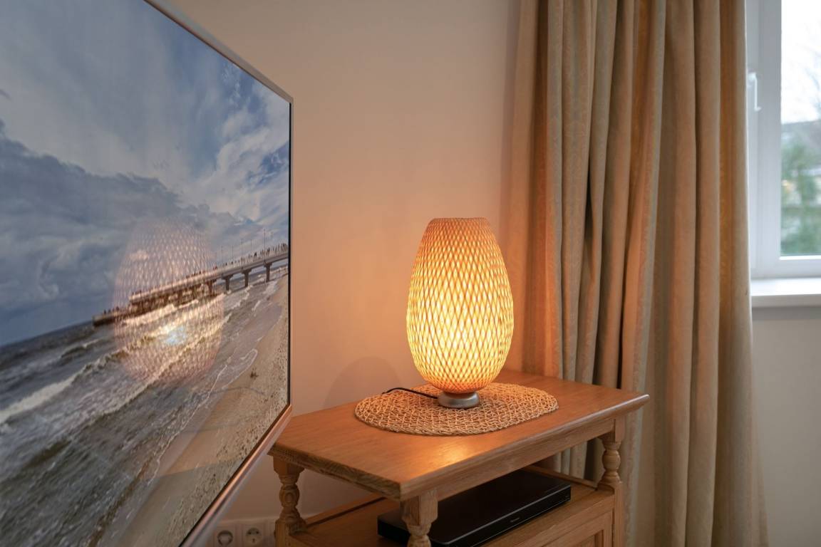 Machen Sie es sich im gemütlichen Wohnbereich mit zwei hochwertigen Schlafsesseln (Liegefläche je 90x200 cm) und Flat-TV bequem. Ein separates Schlafzimmer mit komfortablem Boxspringbett (180x200 cm) und 2. TV lädt zu erholsamen Stunden nach langen Strandtagen ein. Das stilvolle Designbad überzeugt mit Annehmlichkeiten wie bodentiefer Wellnessdusche, Schminkspiegel und Fußbodenheizung. In der offen gestalteten, gut ausgestatteten Küchenzeile mit hochwertigen Alltagshelfern wie Backofen, Spülmaschine, sowie 4-Platten-Ceranfeld lassen sich im Handumdrehen leckere Ferienmahlzeiten zubereiten. Der lichtdurchflutete und großzügige Essbereich für bis zu 4 Personen hat einem direkten Zugang zum überdachten, möblierten Balkon. Von hier aus öffnet sich der Blick ins Grüne – Ruhe, Entspannung und ein Hauch von Ostsee in der Ferne. Erholung pur!
