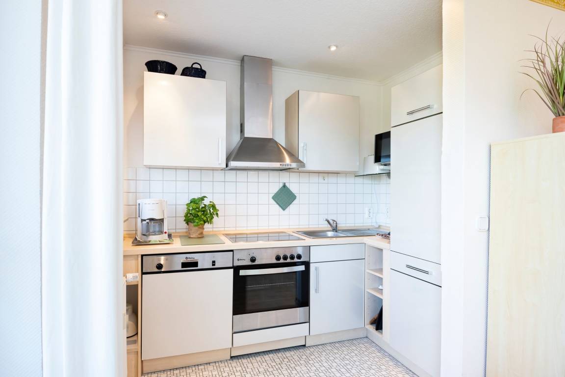 Im Wohnraum steht Ihnen eine gemütliche Sitzgarnitur mit einem Smart-TV und einem Essbereich zur Verfügung. Des Weiteren gibt es einen Schlafplatz mit einem Doppelbett (180x200 cm). In der Küche befinden sich ein Ceranfeld, Backofen, Mikrowelle mit Grill, Toaster, Wasserkocher und eine Geschirrspülmaschine. Zusätzlich zu einer Kaffee-Filtermaschine gibt es eine Kaffee-Padmaschine.