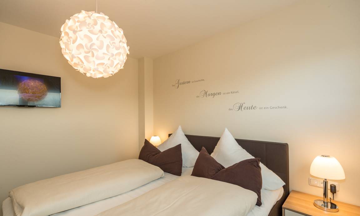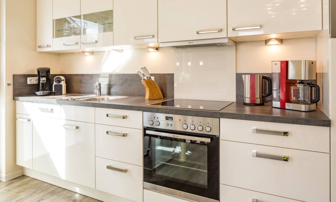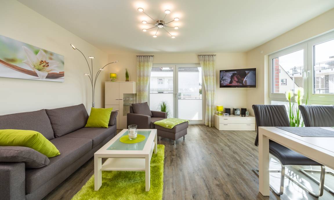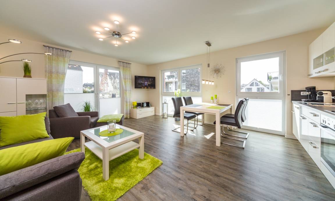 Diese schöne Ferienwohnung ist durchgehend mit einem Bodenbelag in Plankenoptik und Fußbodenheizung ausgestattet. Der Wohnraum verfügt über einen Essbereich sowie einen gemütlichen Sitzbereich. Die Couch lässt sich mit nur wenigen Handgriffen in eine bequeme Schlafcouch (1,80 x 2,00 m) umfunktionieren. Neben dem Flachbildfernseher und dem Blu-ray-Player steht Ihnen eine moderne HiFi-Anlage zur Verfügung. Kostenloses WLAN ist selbstverständlich und auch ein Telefon, mit dem Sie kostenfrei ins deutsche Festnetz (außer Sonderrufnummern) telefonieren können, ist vorhanden. Der Balkon Richtung Süden ist mit einem hochwertigen Tisch und Stühlen ausgestattet. Die moderne Küche lässt keine Wünsche offen. Neben einer Filterkaffeemaschine stehen zusätzlich eine Nespresso-Kapselmaschine und eine Senseo-Maschine für Sie bereit. Das Schlafzimmer ist mit einem geräumigen Schrank, einem komfortablen Boxspringbett (1,80 x 2,00 m) sowie einem Flachbildfernseher ausgestattet. Im modernen Tageslichtbad befinden sich zusätzlich ein Handtuchheizkörper und eine Waschmaschine. Eine bodengleiche Dusche mit Regenduschkopf und ein Radio machen dieses Bad komplett.